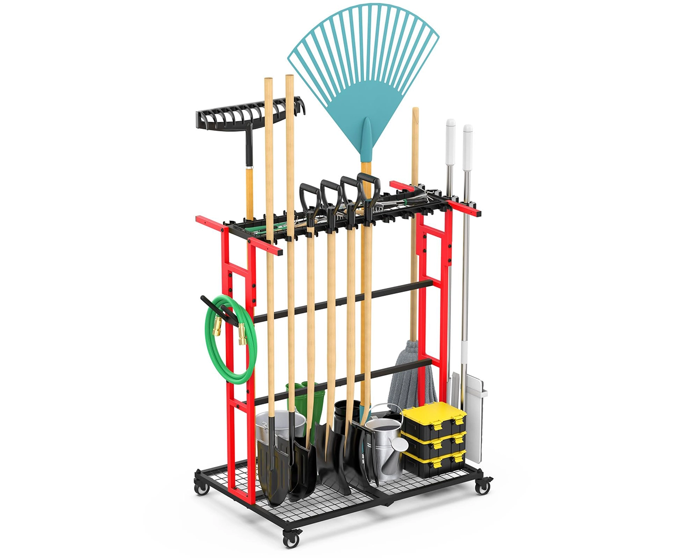 CCCEI’s wheeled garage organizer keeps yard and garden tools neatly stored and easily accessible, with holders for brooms, shovels, rakes, and more.