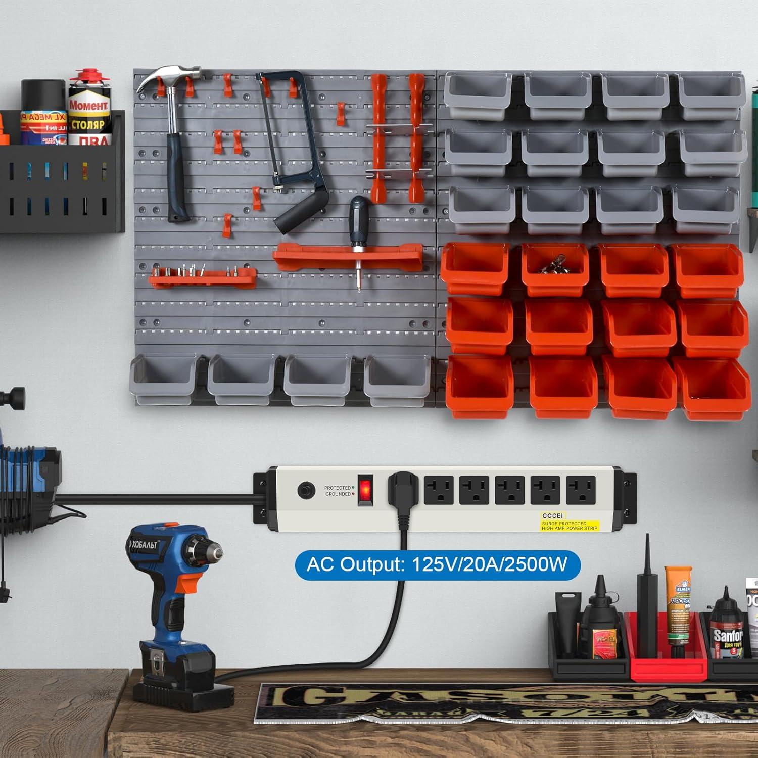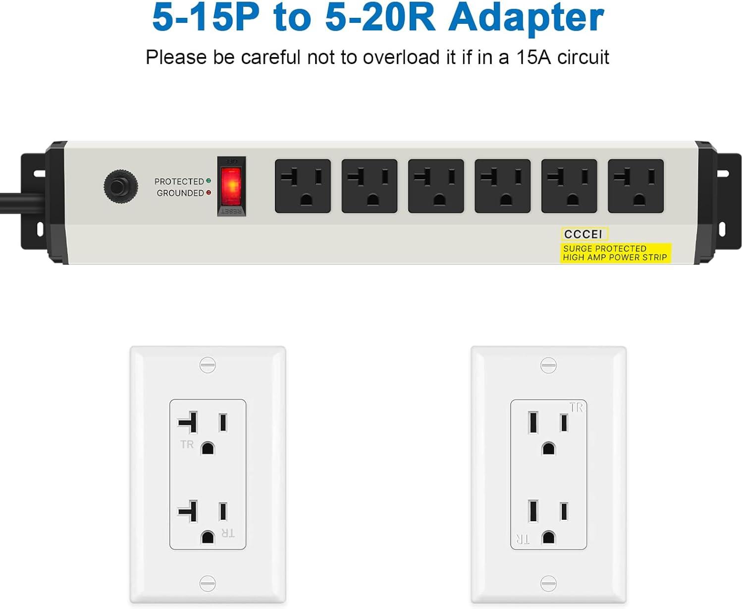 Garage 6 outlets power strip surge protector 4800J enough for larger surges, with 12awg 5-15P extension cord, 6-20R T-Slot adapter for more appliance. Can plug it into a 15A or 20A outlets, if you are using it in a 15A system, do not exceed 1875W.