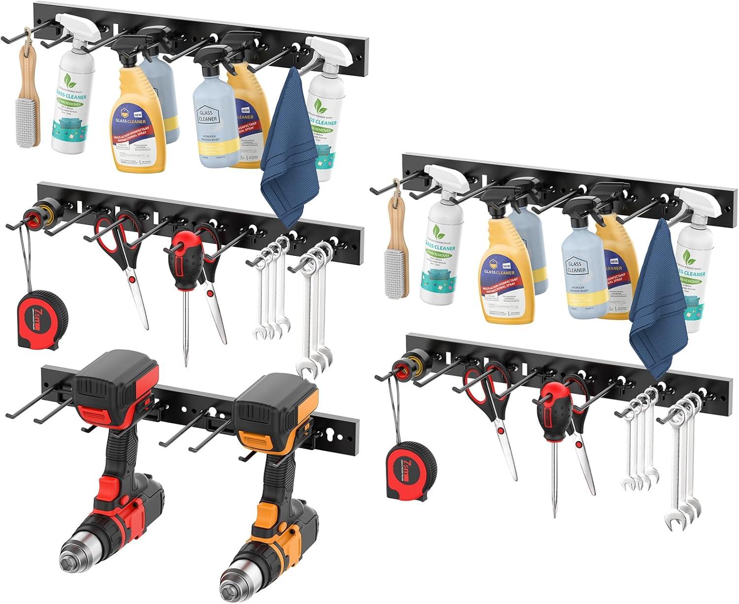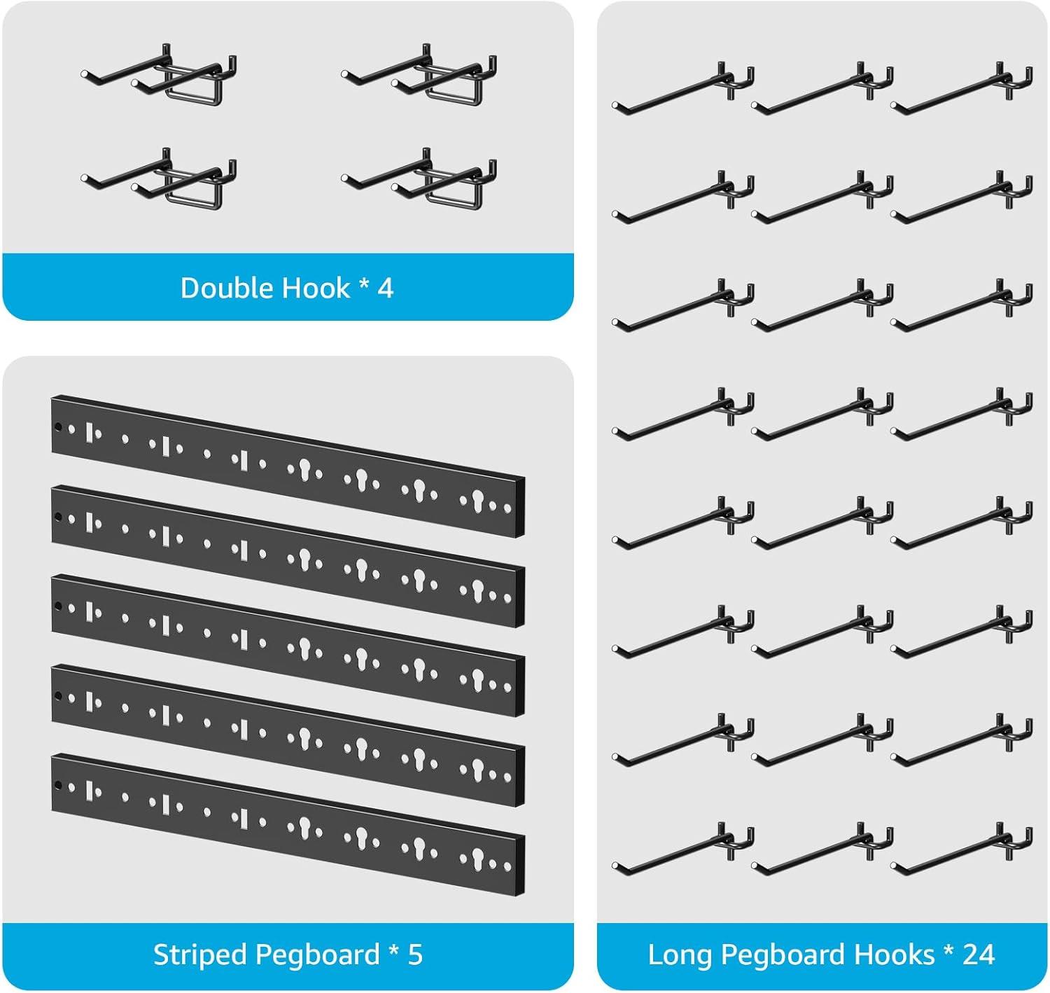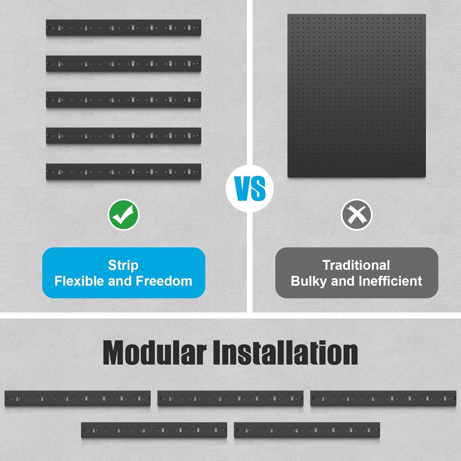 Black modular wall mount pegboard strip, 5 strips with 24 pegboard hooks and 4 pegboard double hooks. Can help store a lot of tools to keep things tidy. Great for building a pegboard wall in your shop, garage, laundry or tool storage area.