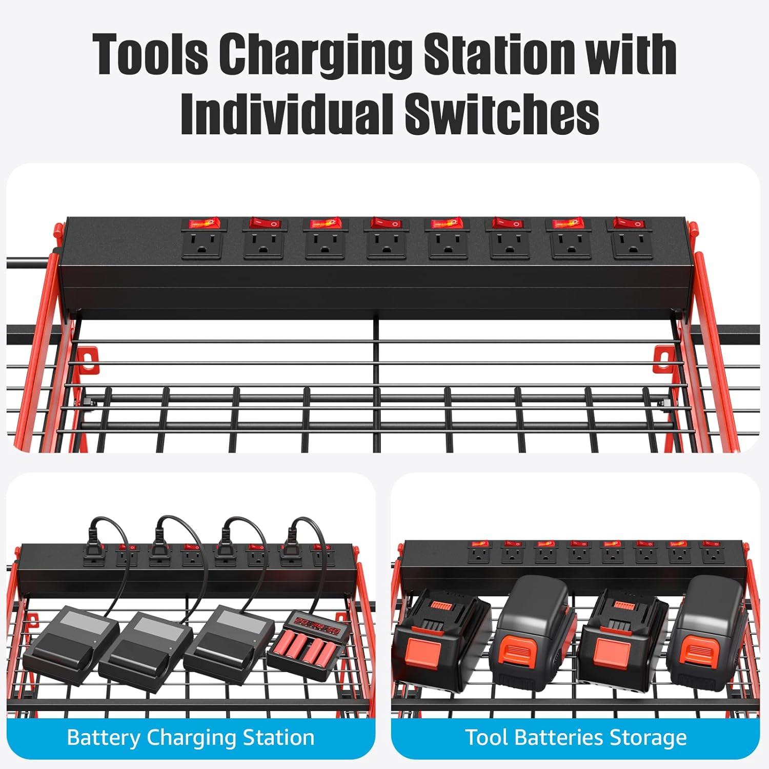 CCCEI Black Power Tool Organizer Wall Mount, Large Tools and Battery Storage Rack Charging Station Individual Switches. Drills Holder, Garage Utility Shelves with 10FT Power Strip. Gift for Men.(Red)