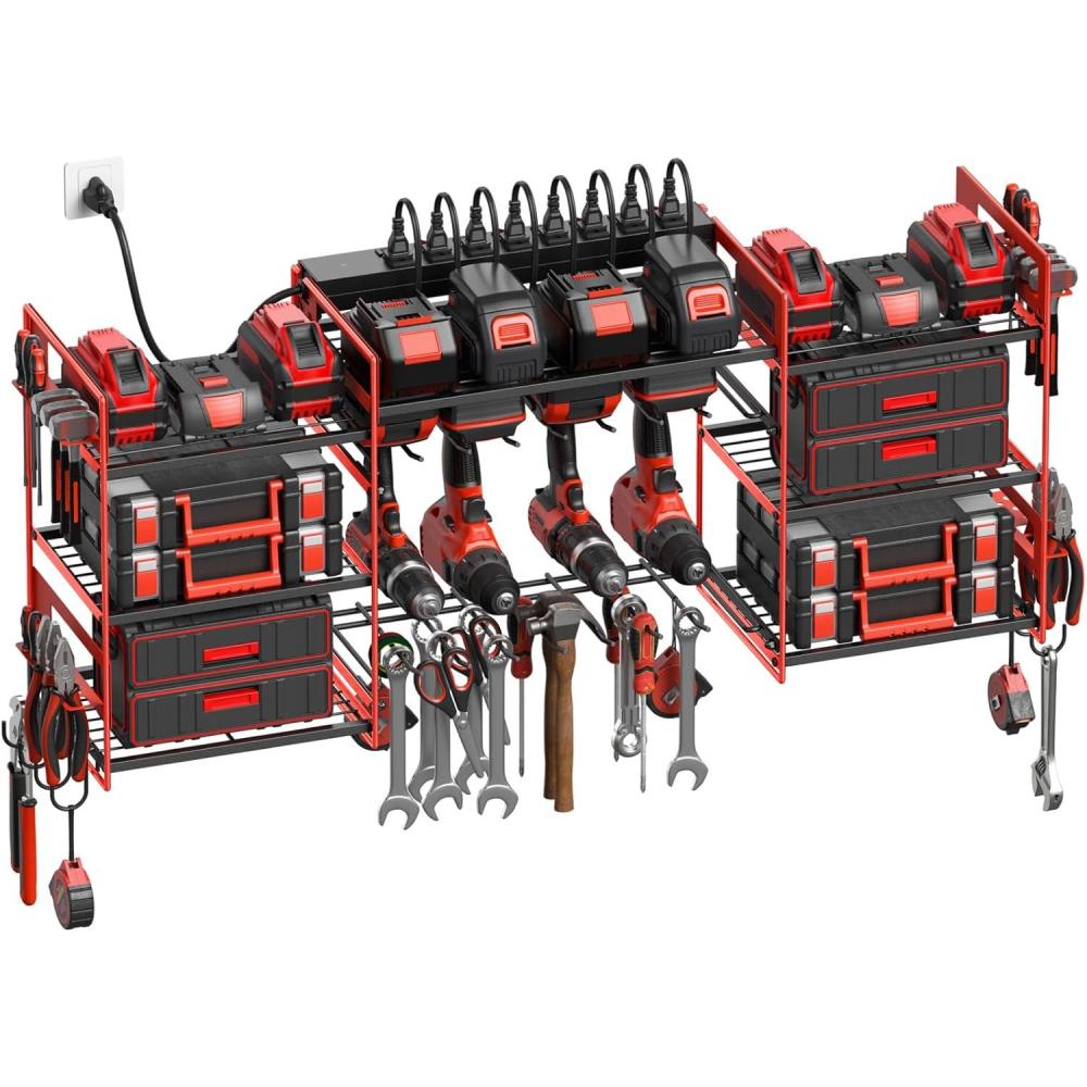 imageCCCEI Black Power Tool Organizer Wall Mount Large Tools and Battery Storage Rack Charging Station Individual Switches Drills Holder Garage Utility Shelves with 10FT Power Strip Gift for MenRed