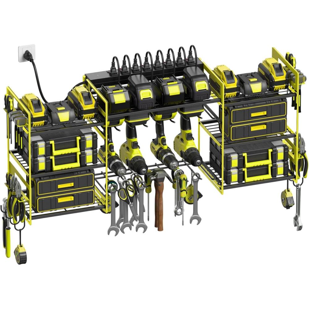 Very convenient for charging your tool batteries, tools rack built-in metal 8 outlets with separate switch, avoids the hassle of unplugging and unplugging repeatedly. with surge protection of 1200J, Able to protect your device to a certain extent. Utility rack size: L:38.8in * W:9.4in * H:16.5in. Can be mounted on wall.