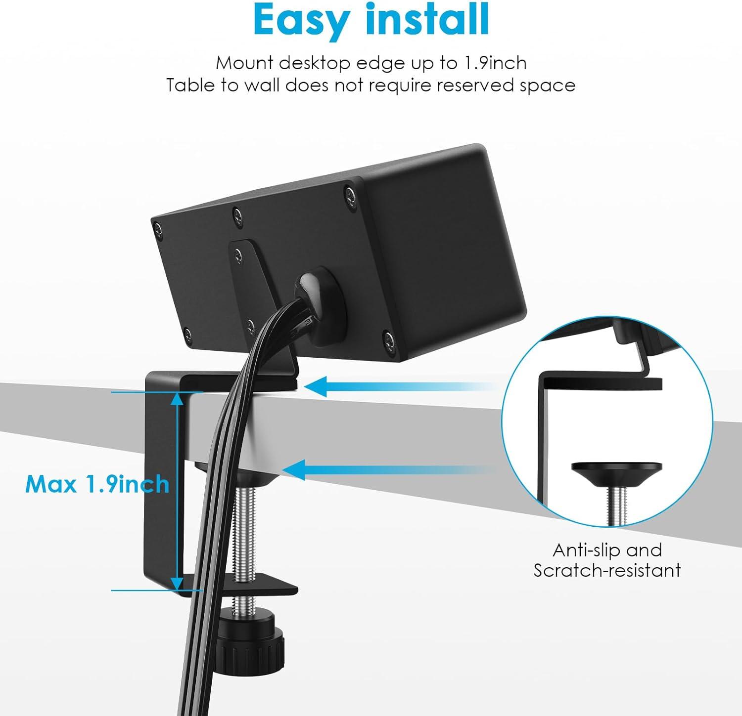 Desktop power strip with angle, easier to plug in or unplug. Only need a small space between the table and the wall. the max desk edge width is about 1.9inch, The upgraded plastic pad can protect your desktop well. Surge protection 1200J.