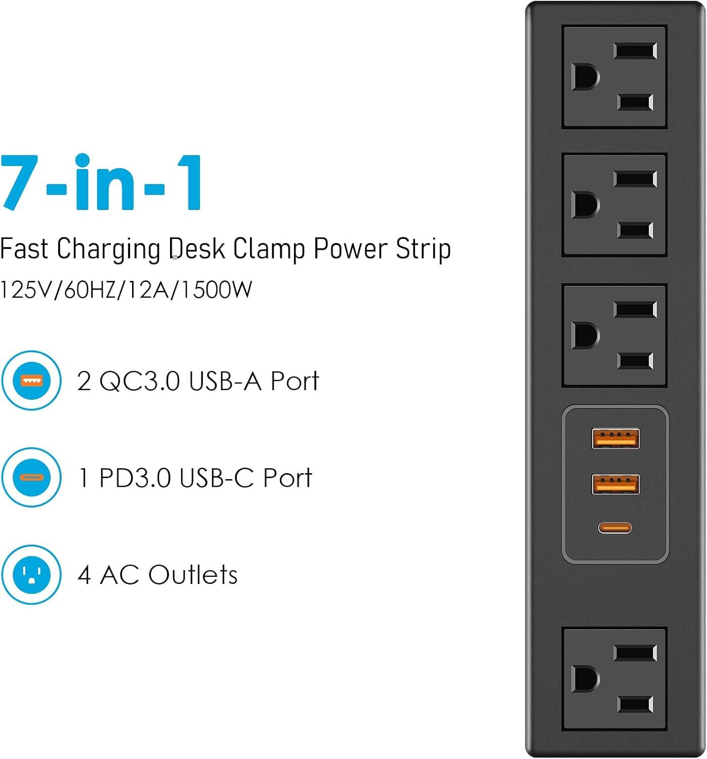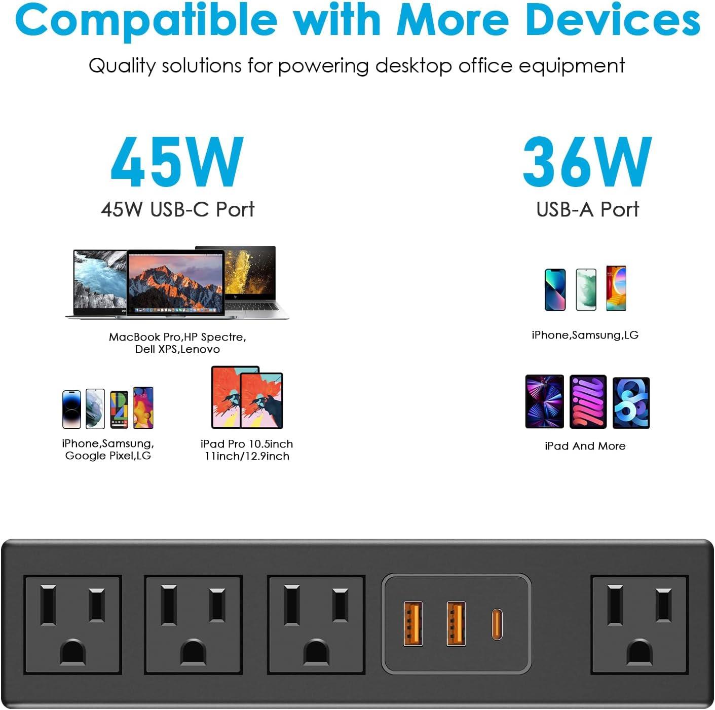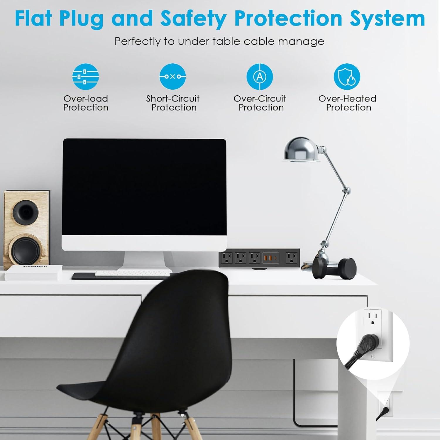 Safe desk mount outlet strip with ETL listed, made of ABS and fireproof material, short-circuit, grounded, overload, over-voltage protection safety system. Please check whether each port is working properly before use.
