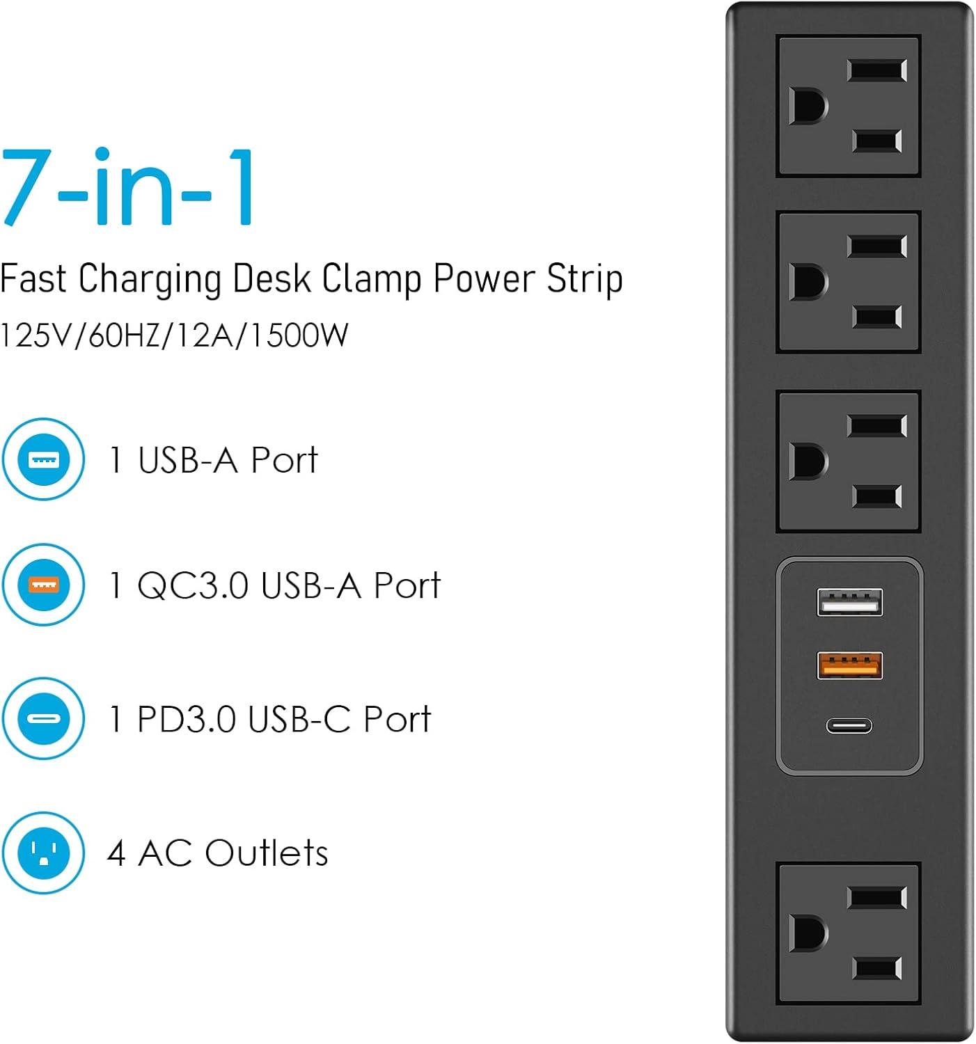 imageCCCEI Desk Clamp Power Strip with USBA and USBC Ports Desktop Mount Surge Protector 1200J Widely Spaced Desk Outlet Station Fast Charging 6 FT Flat Plug Fit 19 inch Tabletop Edge BlackBlack20W