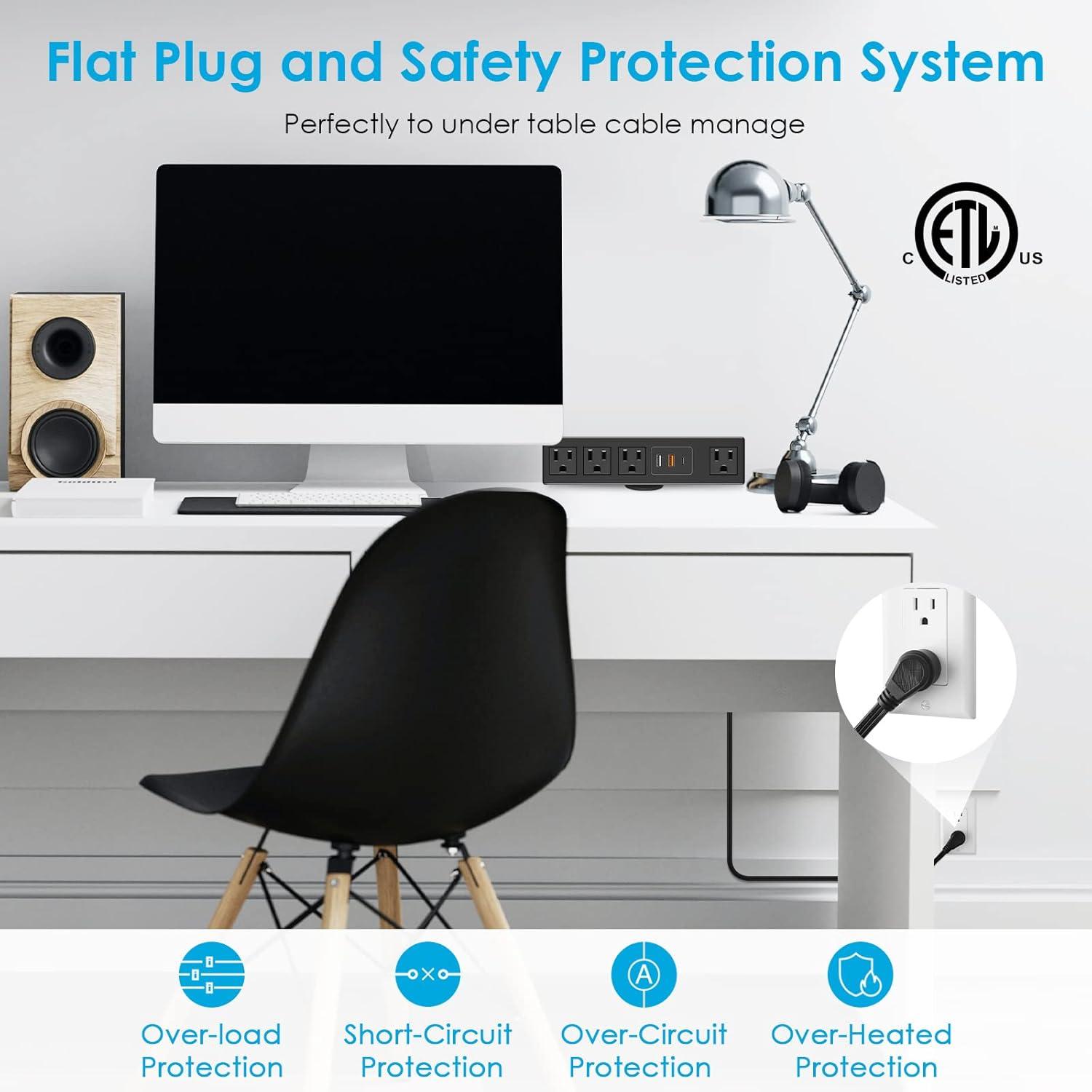 Safe desk mount outlet strip with ETL listed, made of ABS and fireproof material, short-circuit, grounded, overload, over-voltage protection safety system. Please check whether each port is working properly before use.