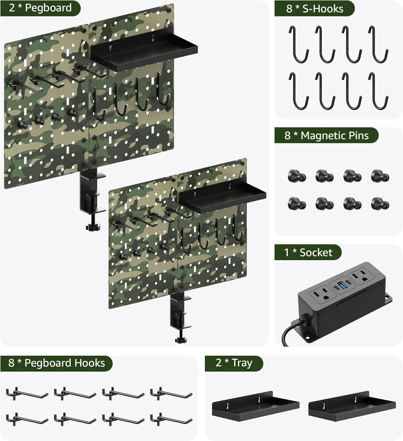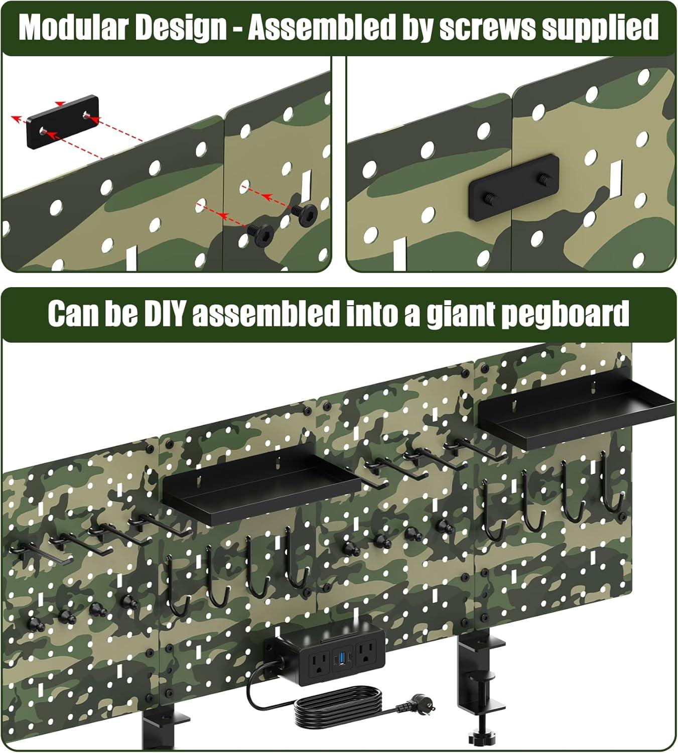 Clamp mount pegboard made of all-metal material and camouflage spray design, more stable than plastic material. Rack size L:16inch * W:12inch. Can be used for long periods of time in a variety of environments such as offices, homes, garages, workplaces, etc.