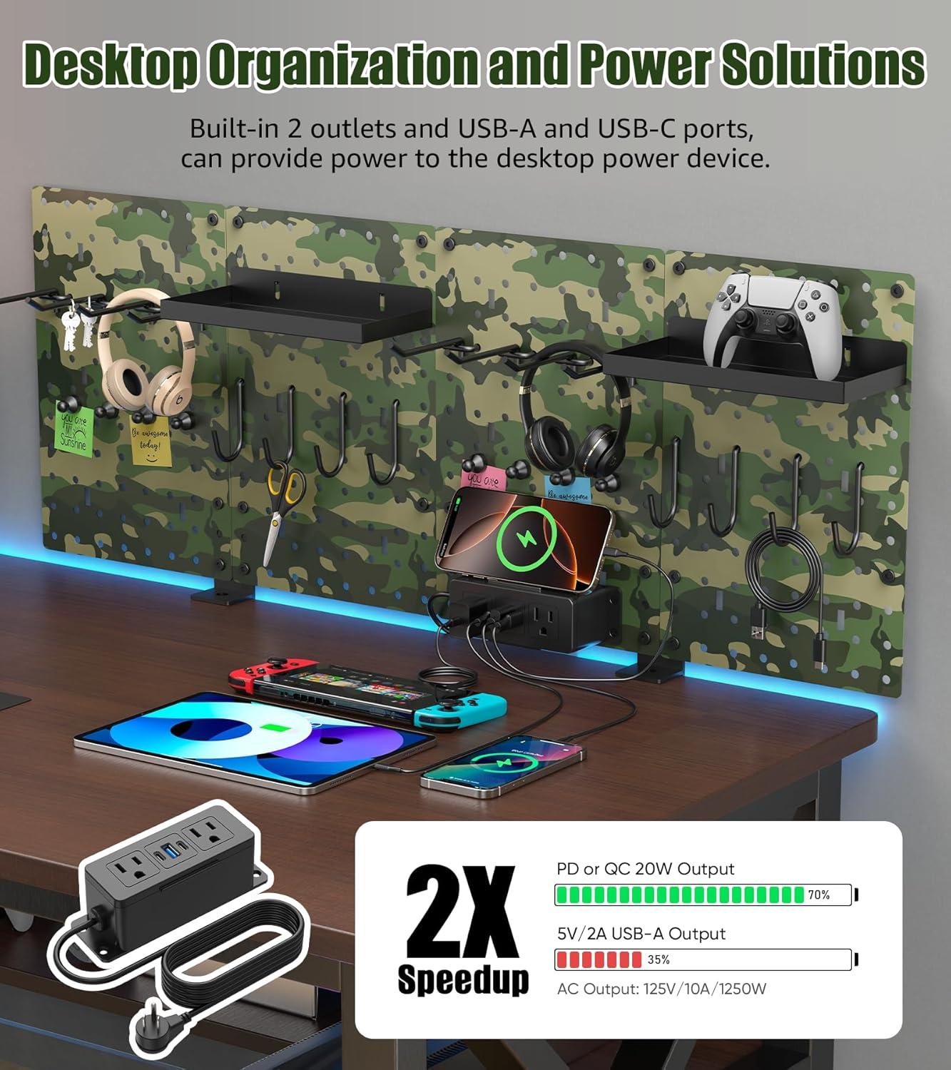 Metal desk pegboard organzier and accessories with power strip, come with table pegboards, pegboard hooks and s hooks, magnetic pins and tray. And set up 2 outlets and 3 of USB ports. 6FT, 10FT flat plug extension cord available options.