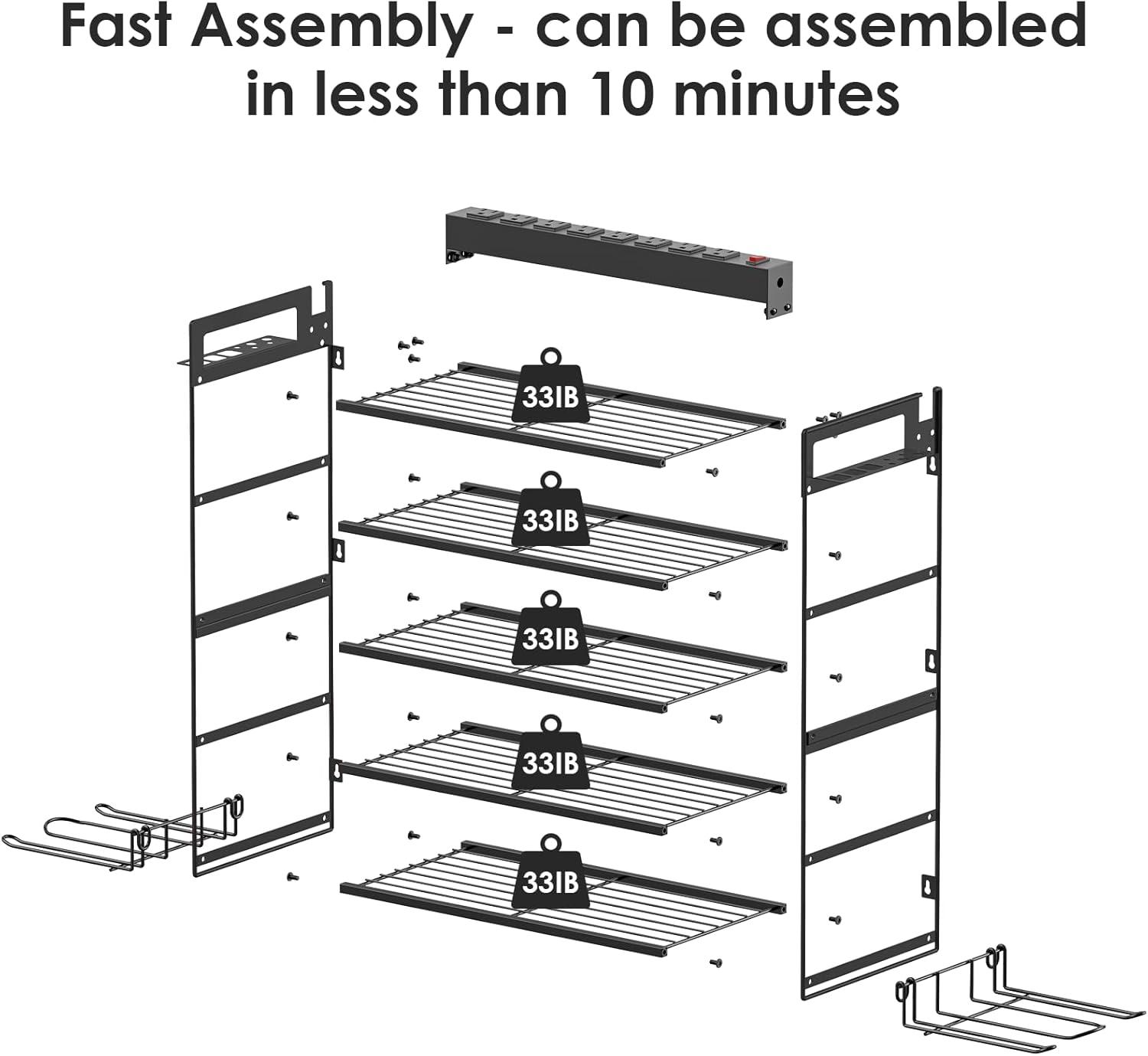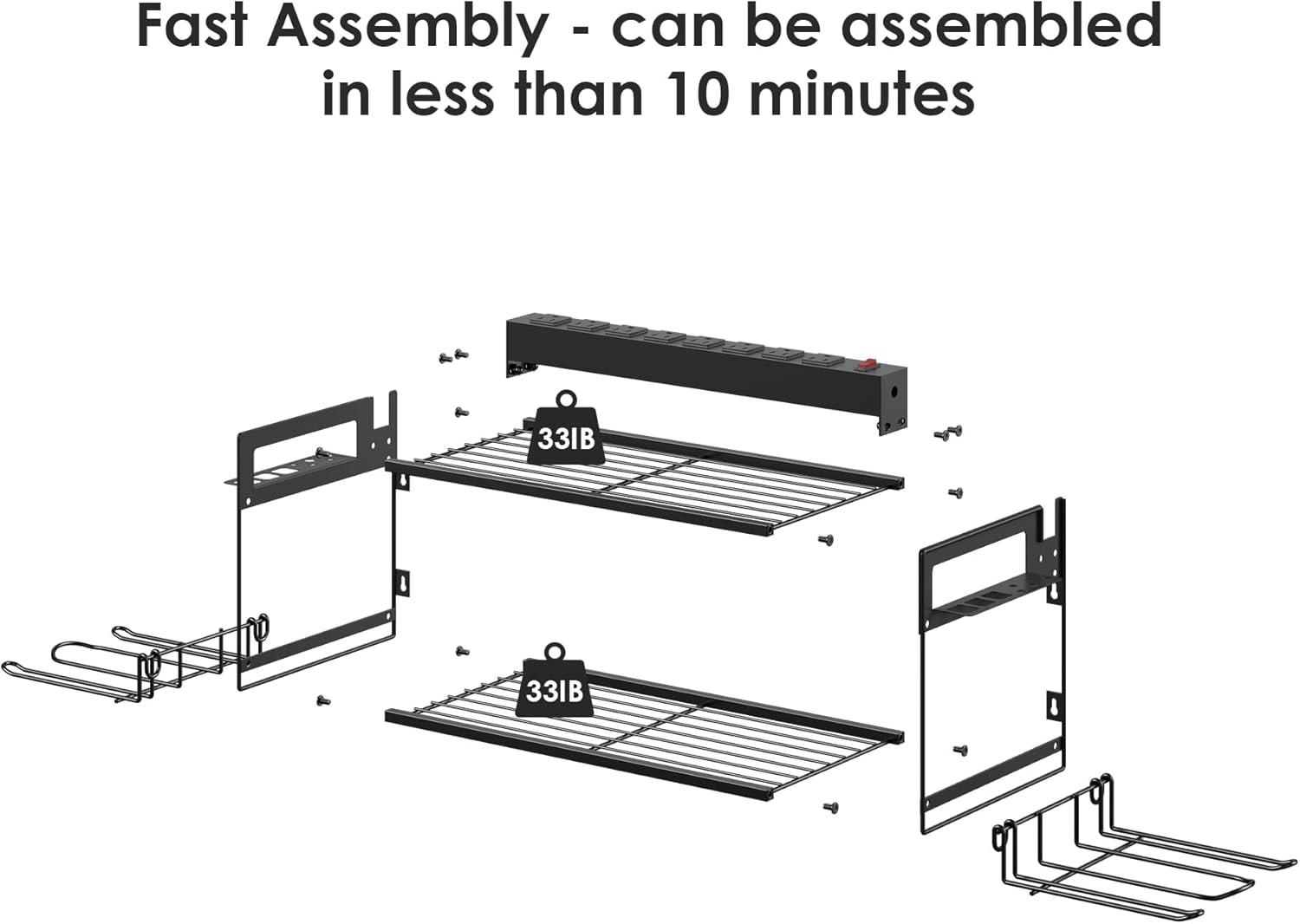 Very convenient for charging your tool batteries, All-in-one design and the metal power strip with surge protection of 1200J, Able to protect your device to a certain extent, output: 125V/15A/1875W. Utility rack size: L:30.9in * W:16.9in * H:9.37in.