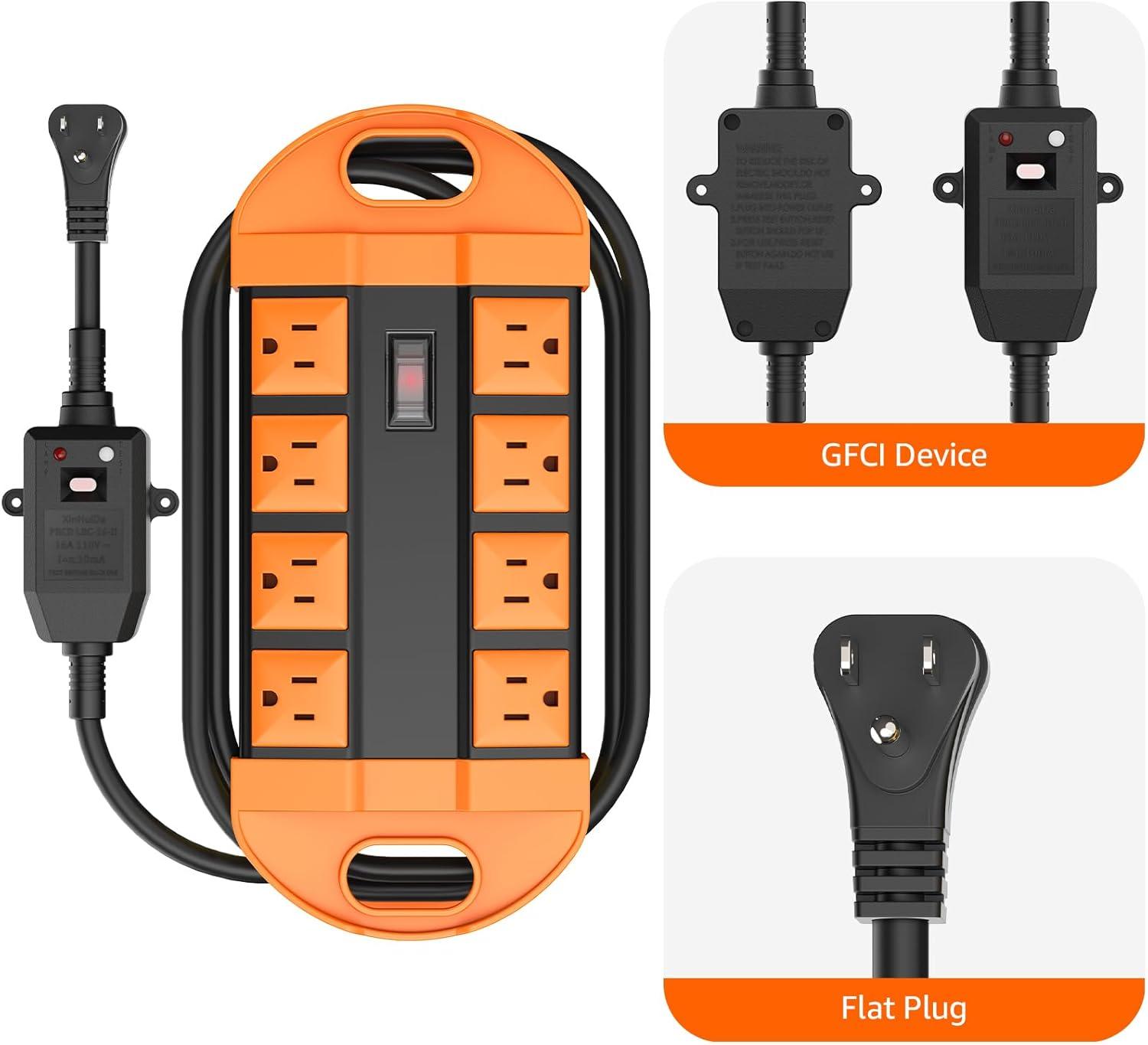CCCEI GFCI Outdoor Power Strip Weatherproof with 8 AC, Waterproof Extension Cord with Multiple Outlets, Wall Mount Surge Protector Flat Plug, Christmas Exterior Garden, Yard, 15FT, Green.(Orange)