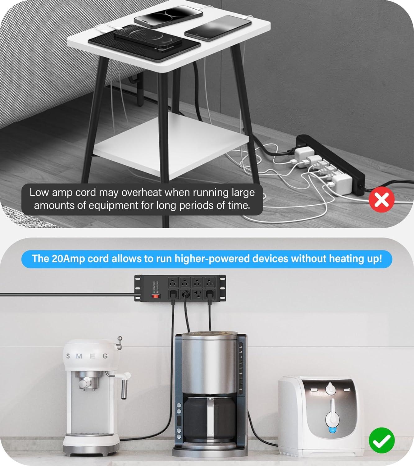 10ft 12 gauge extension cord, available in multiple length options, rating: 15A/125V/1875w. With a heavier-duty power cord, the cable remains cool even when eight devices are running at full capacity simultaneously.