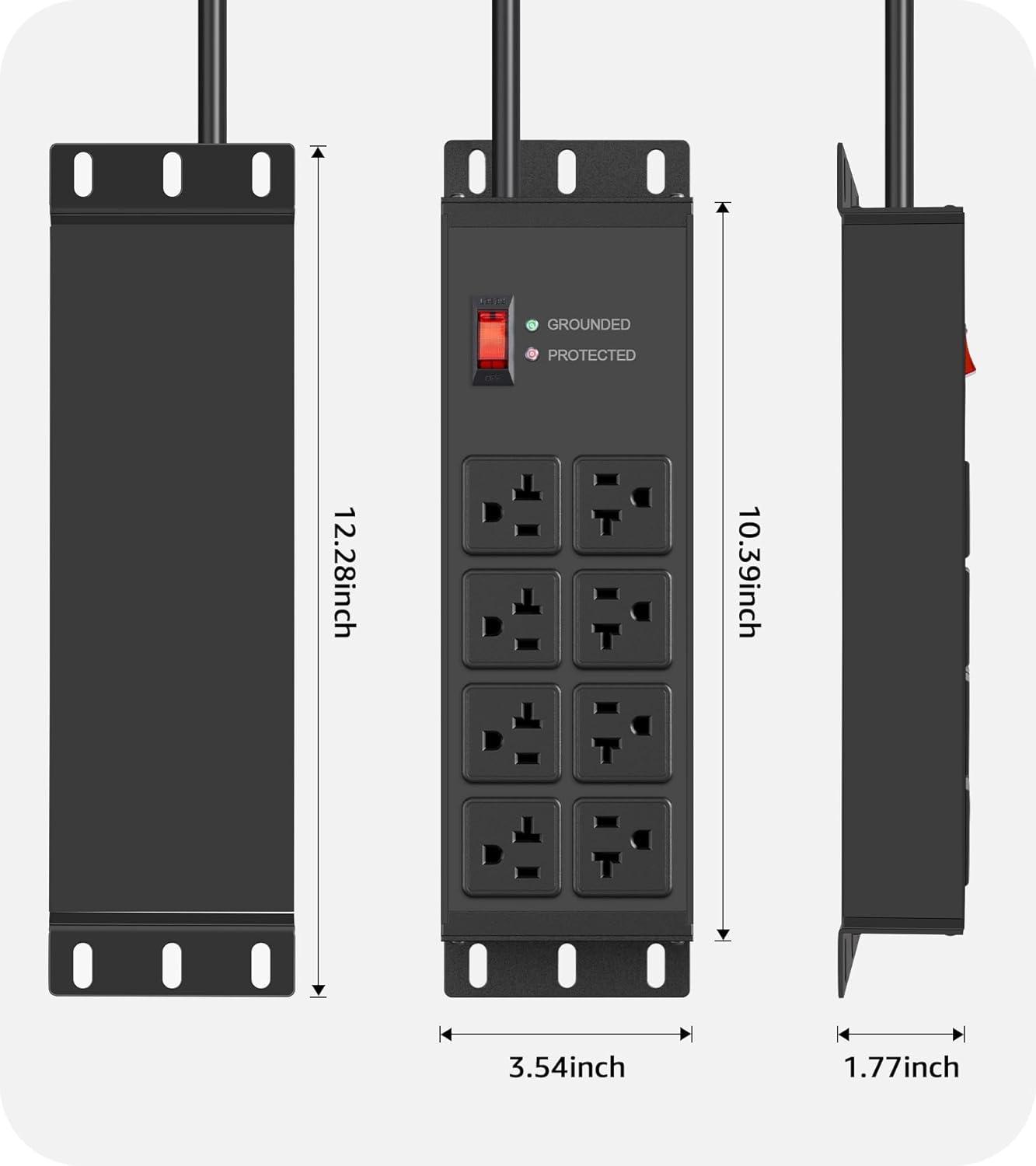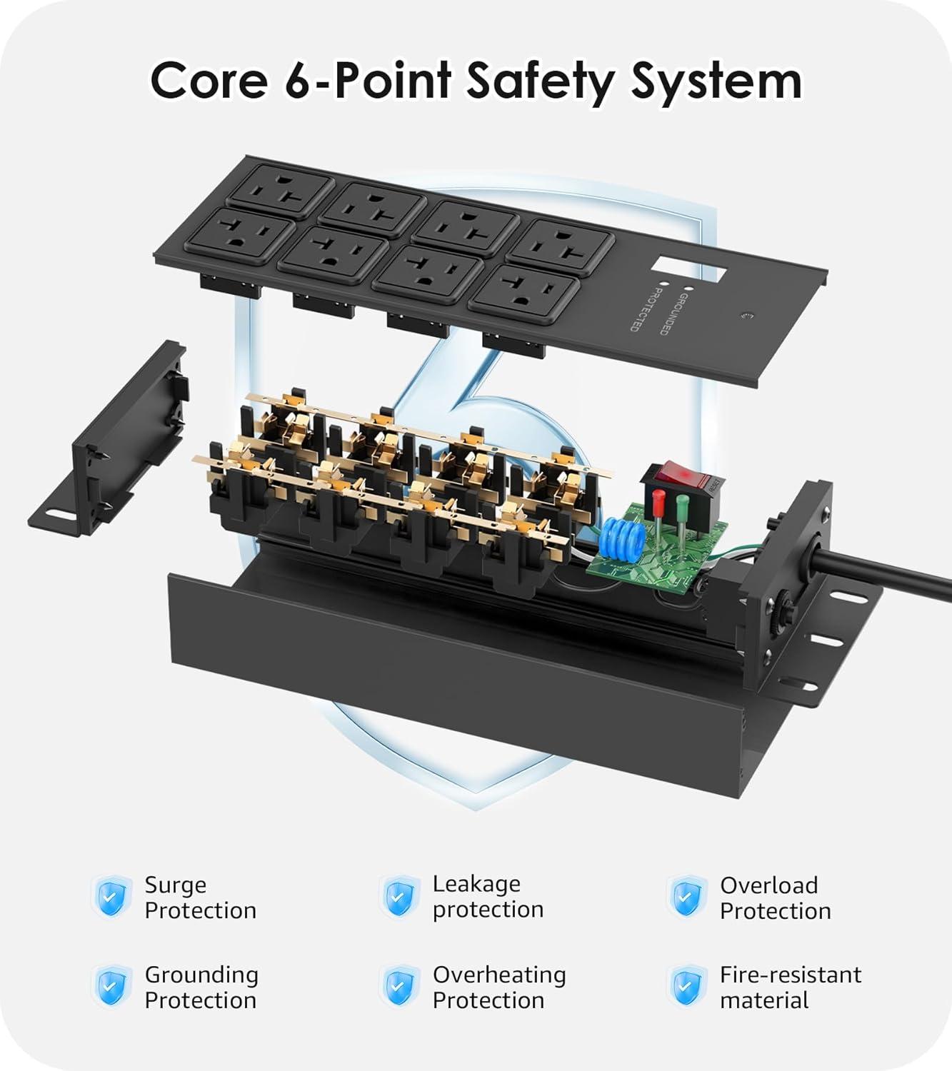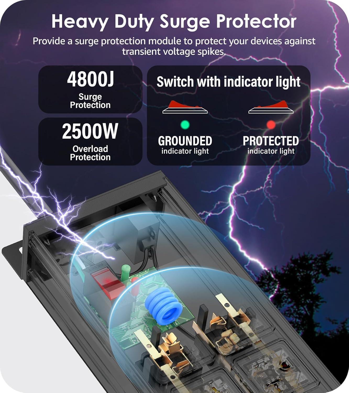 The surge protector power strip features a built-in surge board that provides 4800 joules of surge protection to safeguard your devices. Equipped with both a master 20A circuit breaker and an overload switch to handle unexpected incidents.