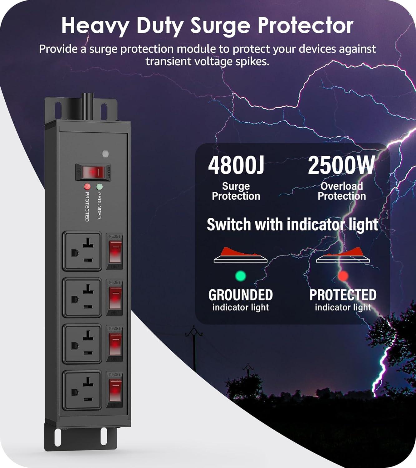 Garage workshop industrial power strip surge protector with grounding, surge protection indicator light, 4800J enough for larger surges, and ensure the safety of connected devices. Provide four wide-spaced sockets.