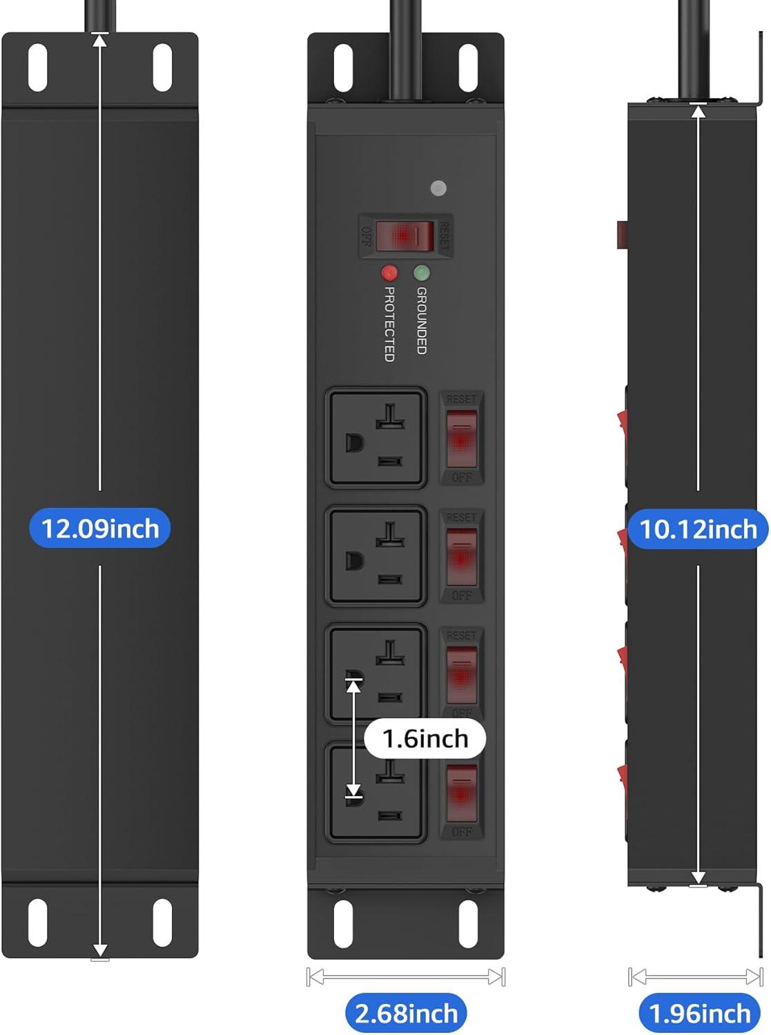 Heavy duty power strip 20 amp with 4 outlets and individual switches, 5-20R, 6-20R and come with standard 3 prong 5-15P plug. Wall mount design, can be applied to high power industrial equipment.