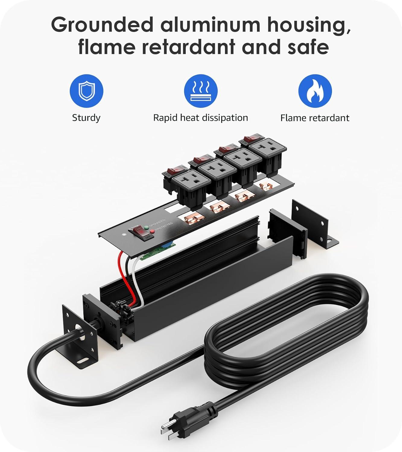 Wall screw mount design, sturdy and durable, ETL list 5019543, thickened metal shell, fireproof, well made power strip and great for a workshop garage shop, Please protect if used as outdoor power strip.