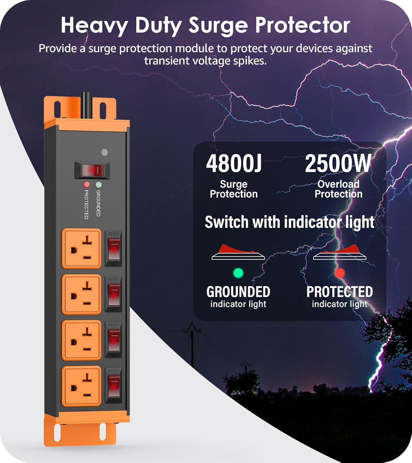 Garage workshop industrial power strip surge protector with grounding, surge protection indicator light, 4800J enough for larger surges, and ensure the safety of connected devices. Provide four wide-spaced sockets.