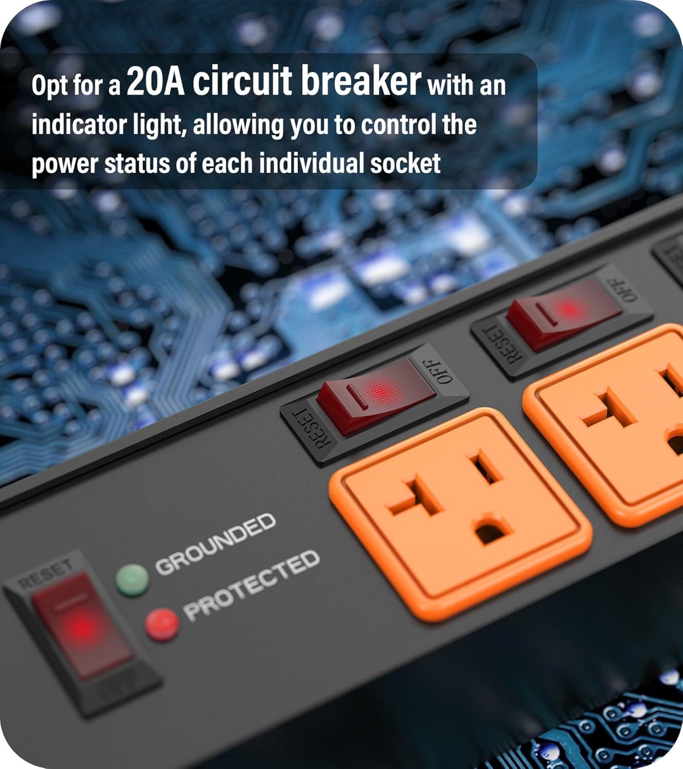 12 gauge 12ft heavy extension cord, rating: AC 20A 125V 2500w. A dedicated 20A circuit breaker allows you to control the circuit independently, eliminating the need to unplug devices or cut off the entire power supply.
