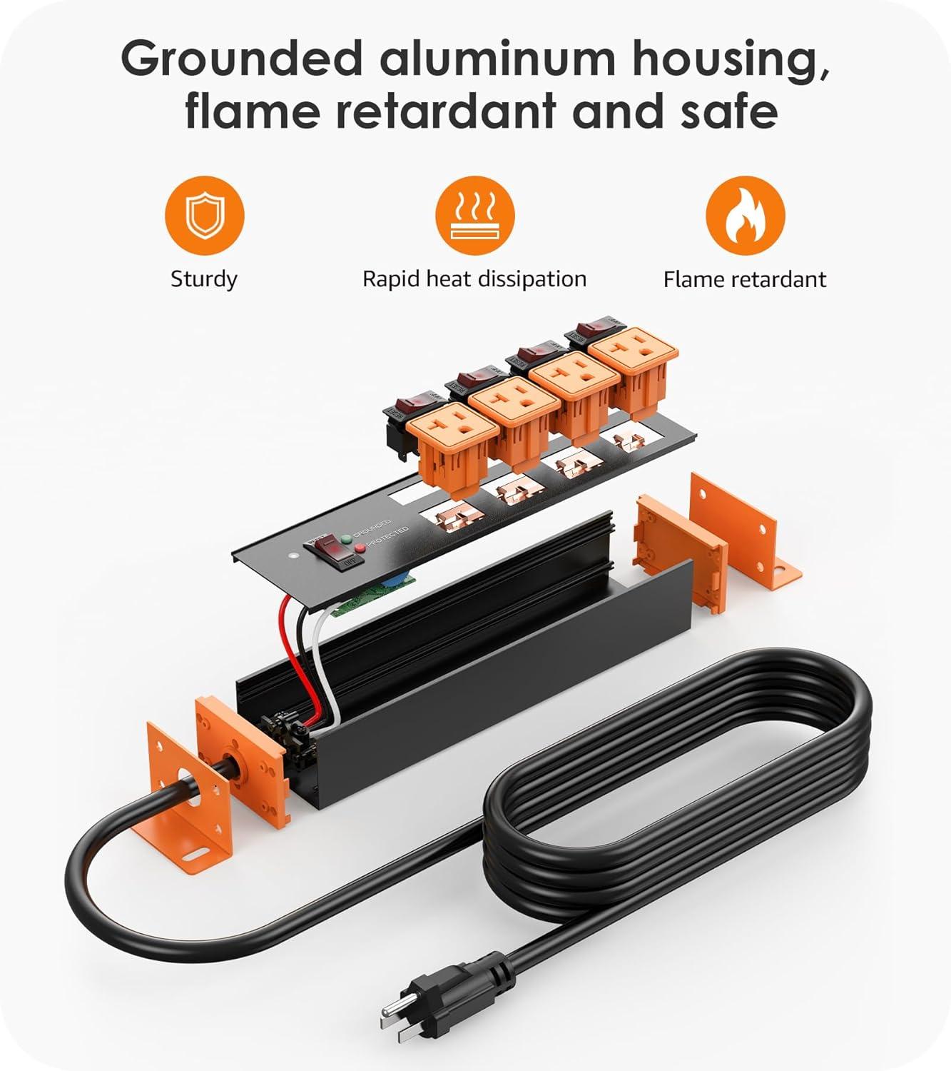 Wall screw mount design, sturdy and durable, ETL list 5019543, thickened metal shell, fireproof, well made power strip and great for a workshop garage shop, Please protect if used as outdoor power strip.