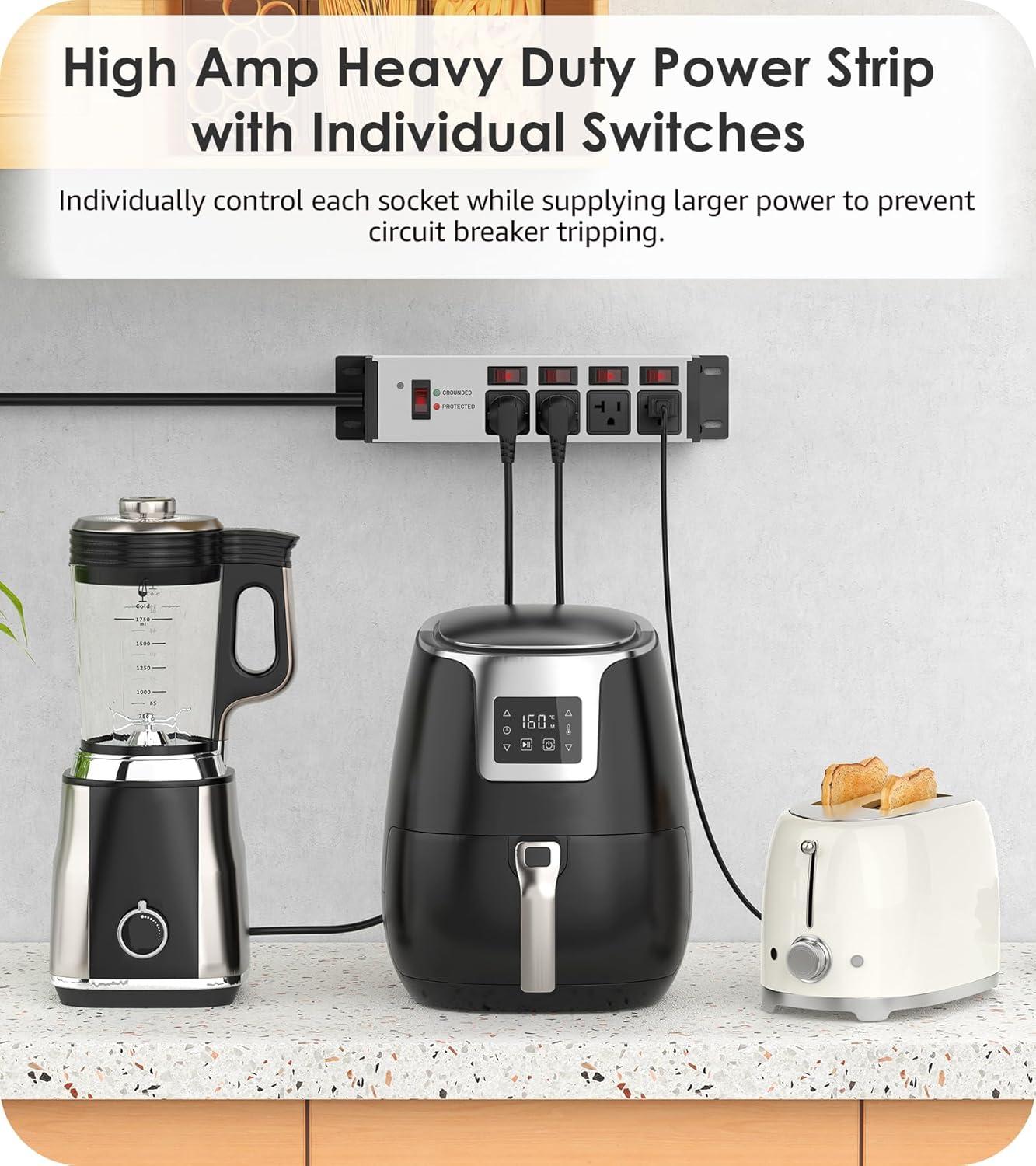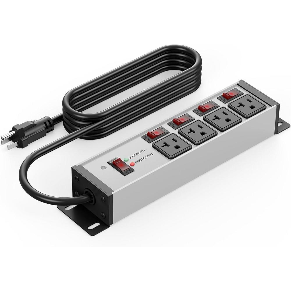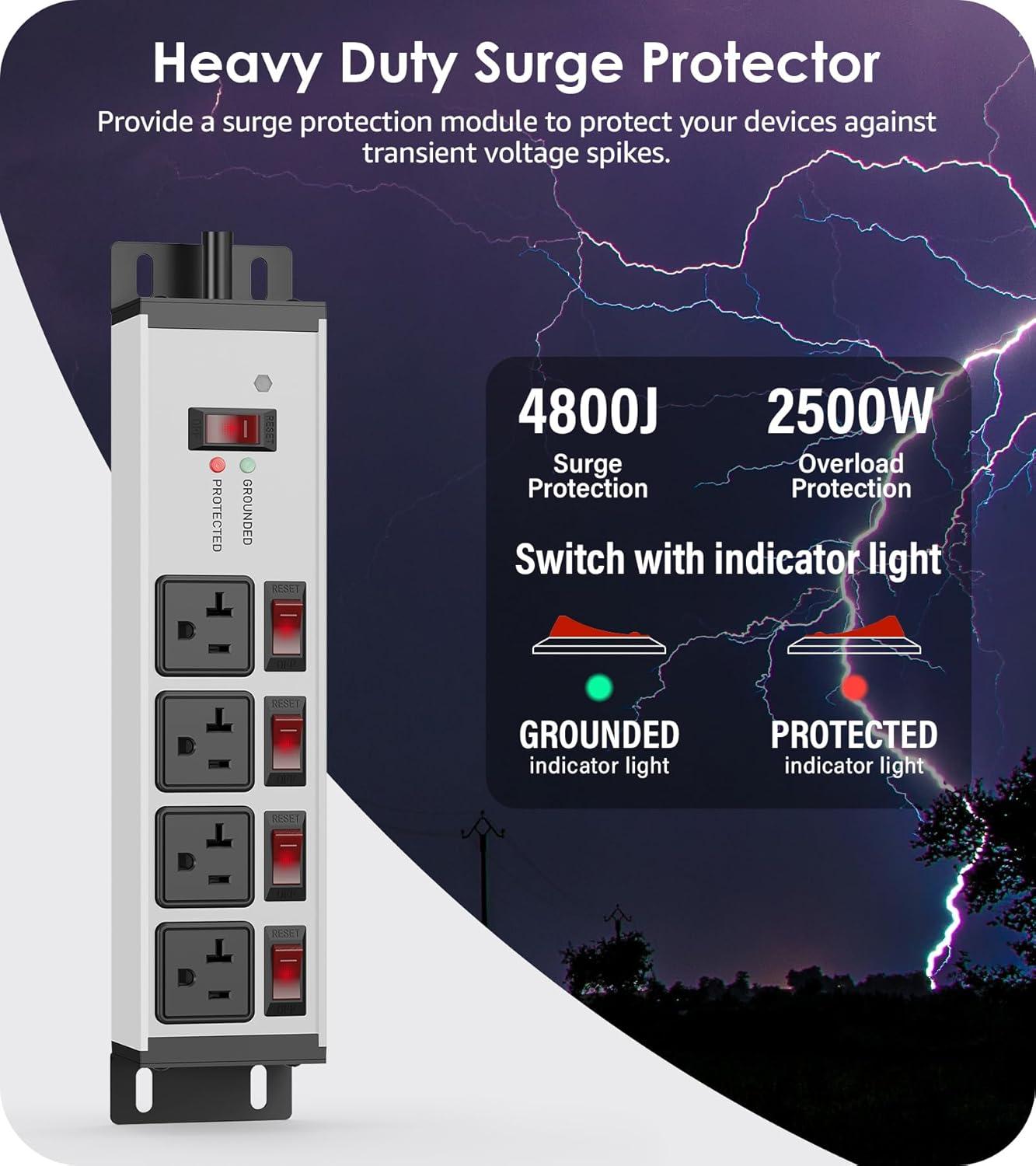 Garage workshop industrial power strip surge protector with grounding, surge protection indicator light, 4800J enough for larger surges, and ensure the safety of connected devices. Provide four wide-spaced sockets.
