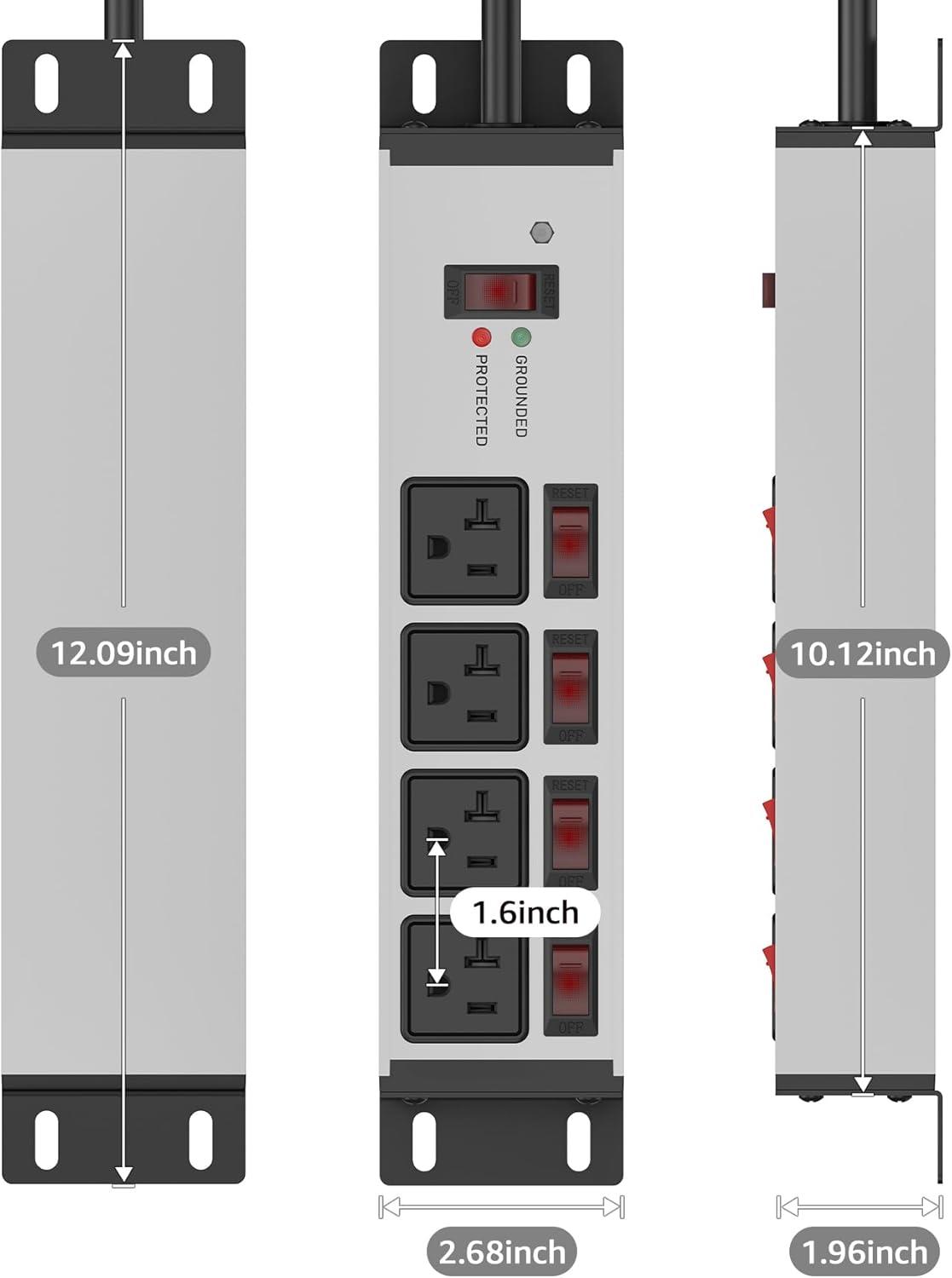 Heavy duty power strip 20 amp with 4 outlets and individual switches, 5-20R, 6-20R and come with standard 3 prong 5-15P plug. Wall mount design, can be applied to high power industrial equipment.