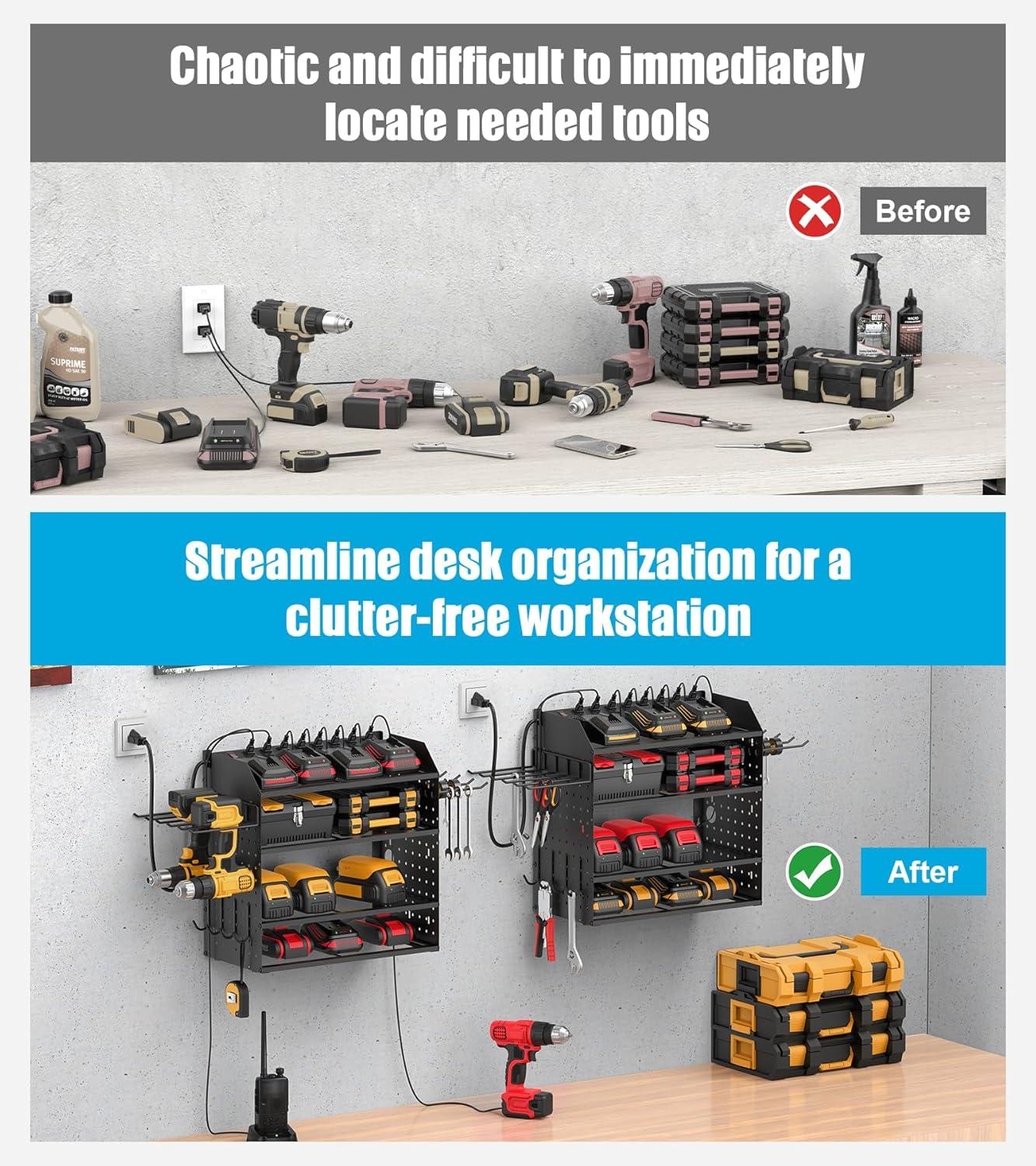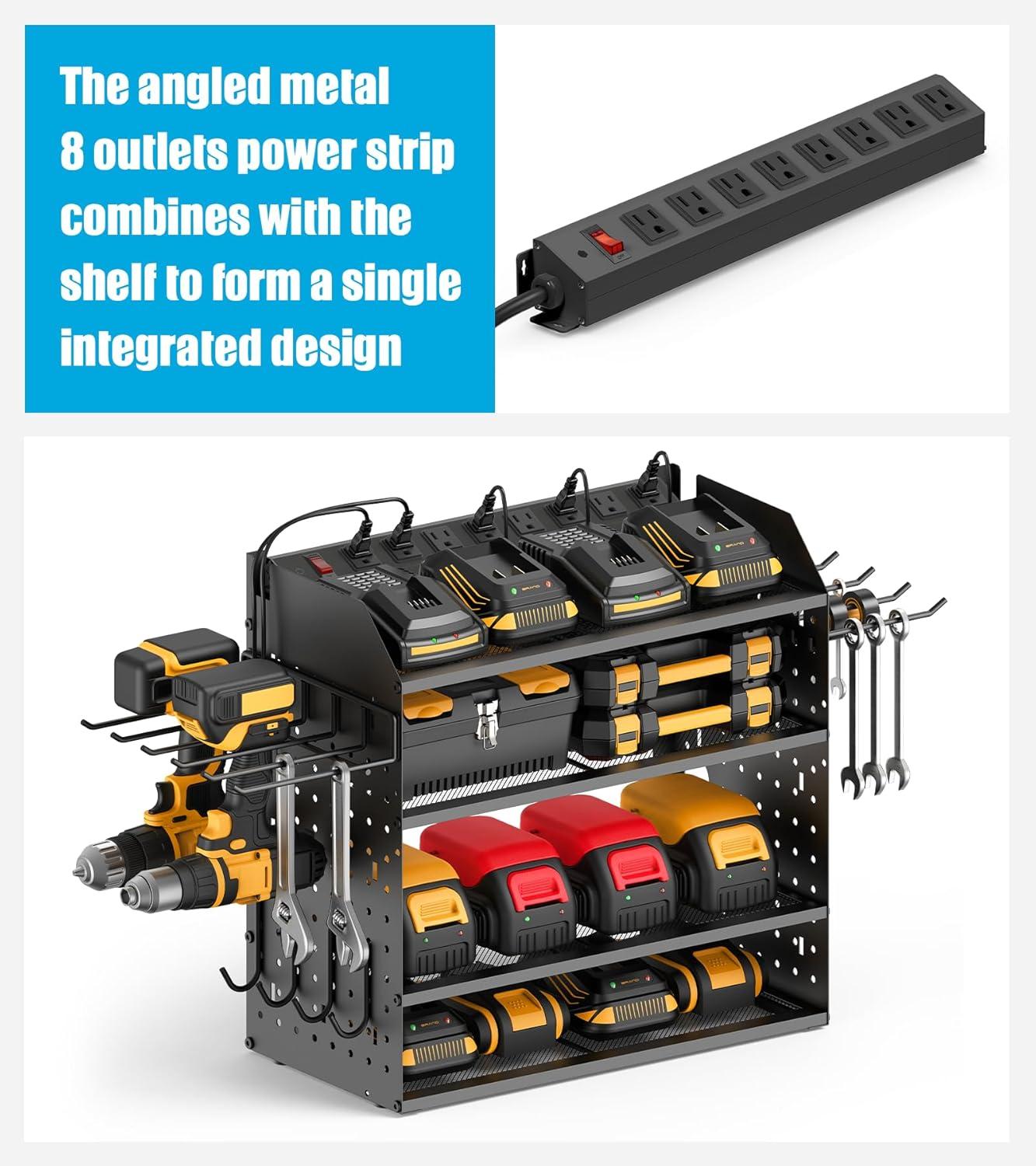 Garage drill and battery organizer and storage, Includes 8 angled power outlets built into the organizer. Features side cord holes to run charger cables up to the top outlets for power. Hides and manages cords at the same time.