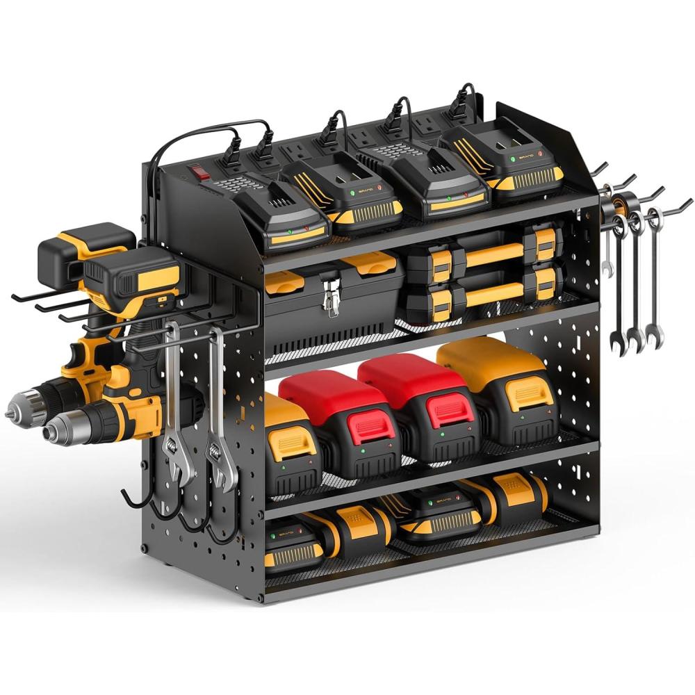 4-tier storage platform design and the sub-top shelf space is adjustable. Includes four S-hooks, four utility pegboard hooks, and one 6 pins steel organizer hook. Perfectly holds gadgets with holes. Cordless power drills when wall-mounted.