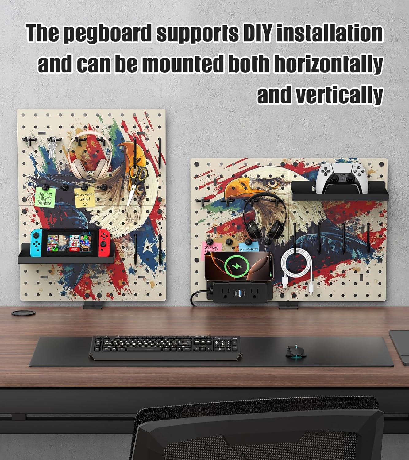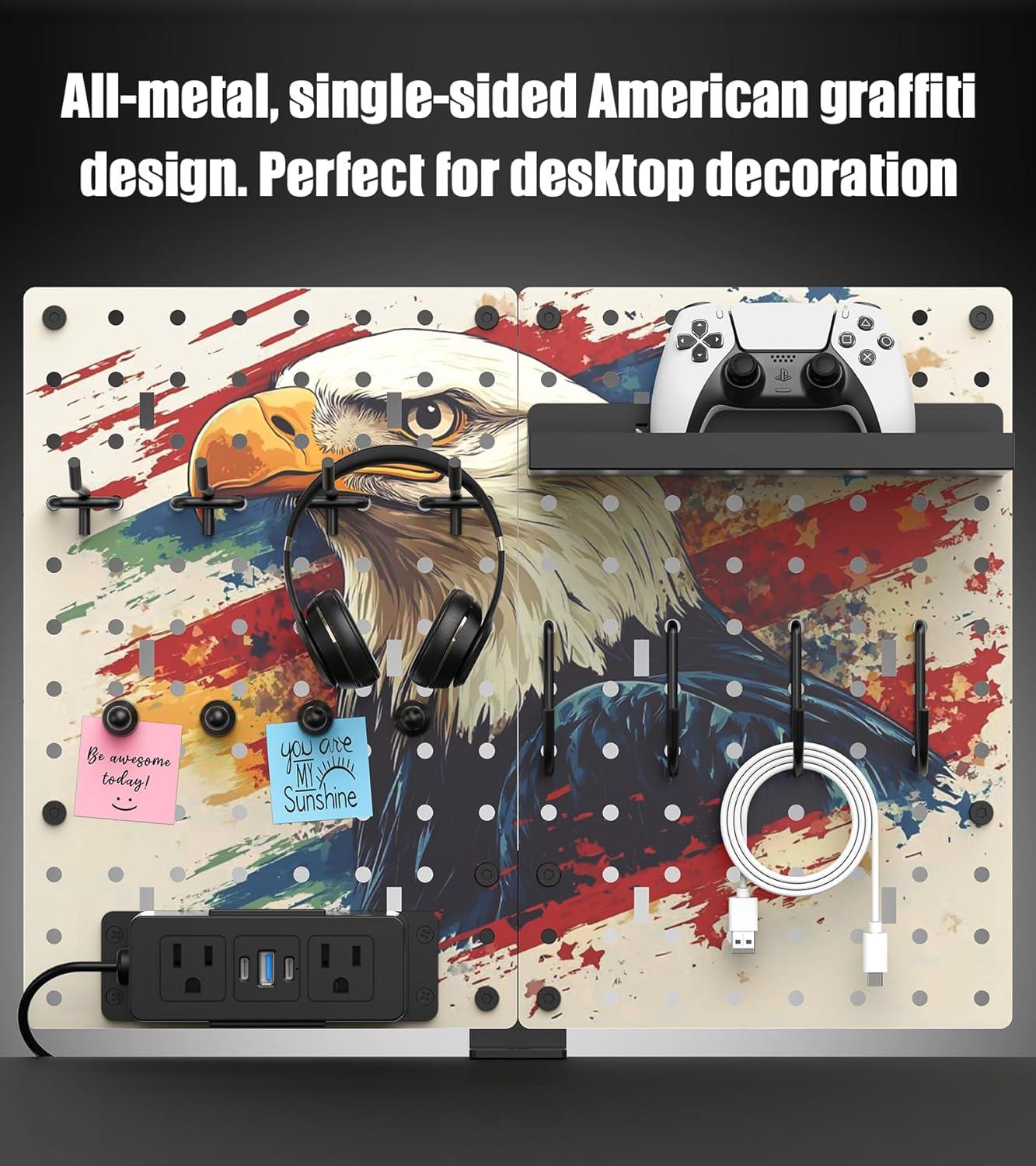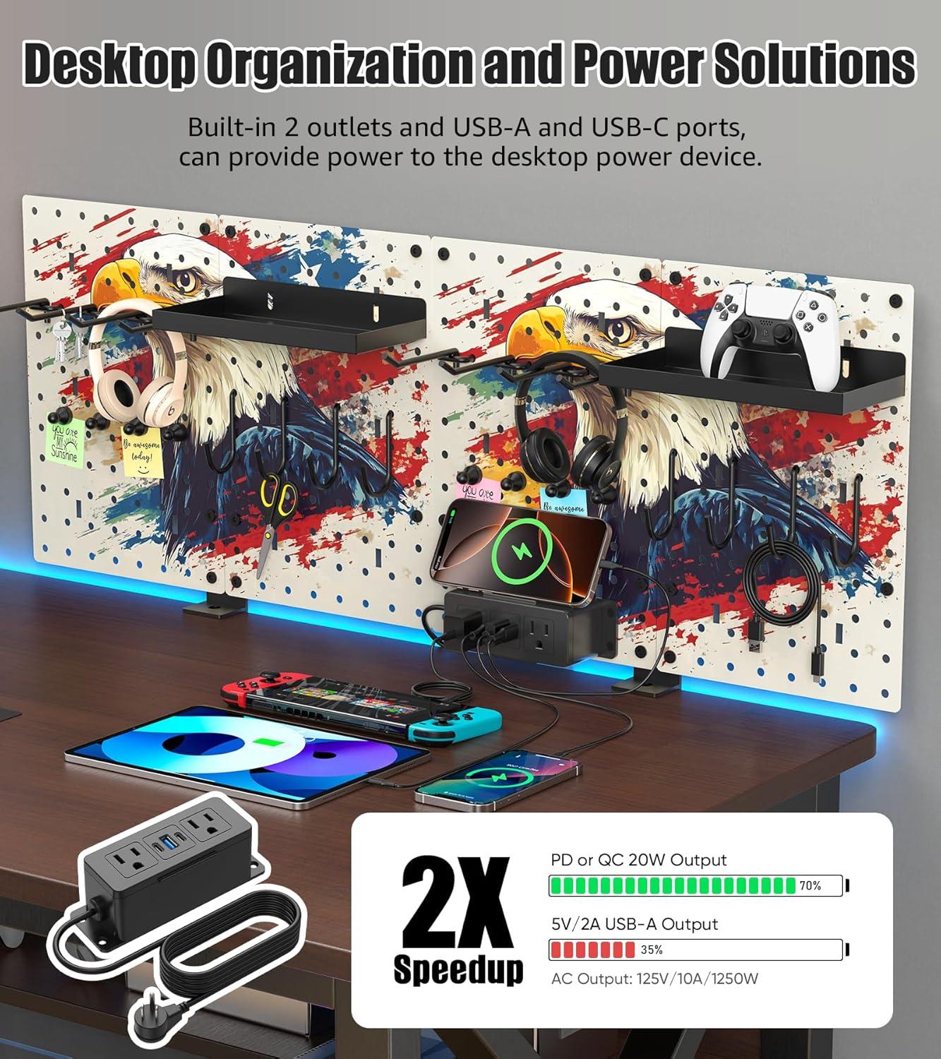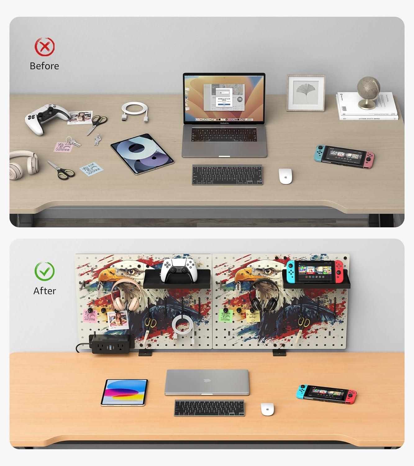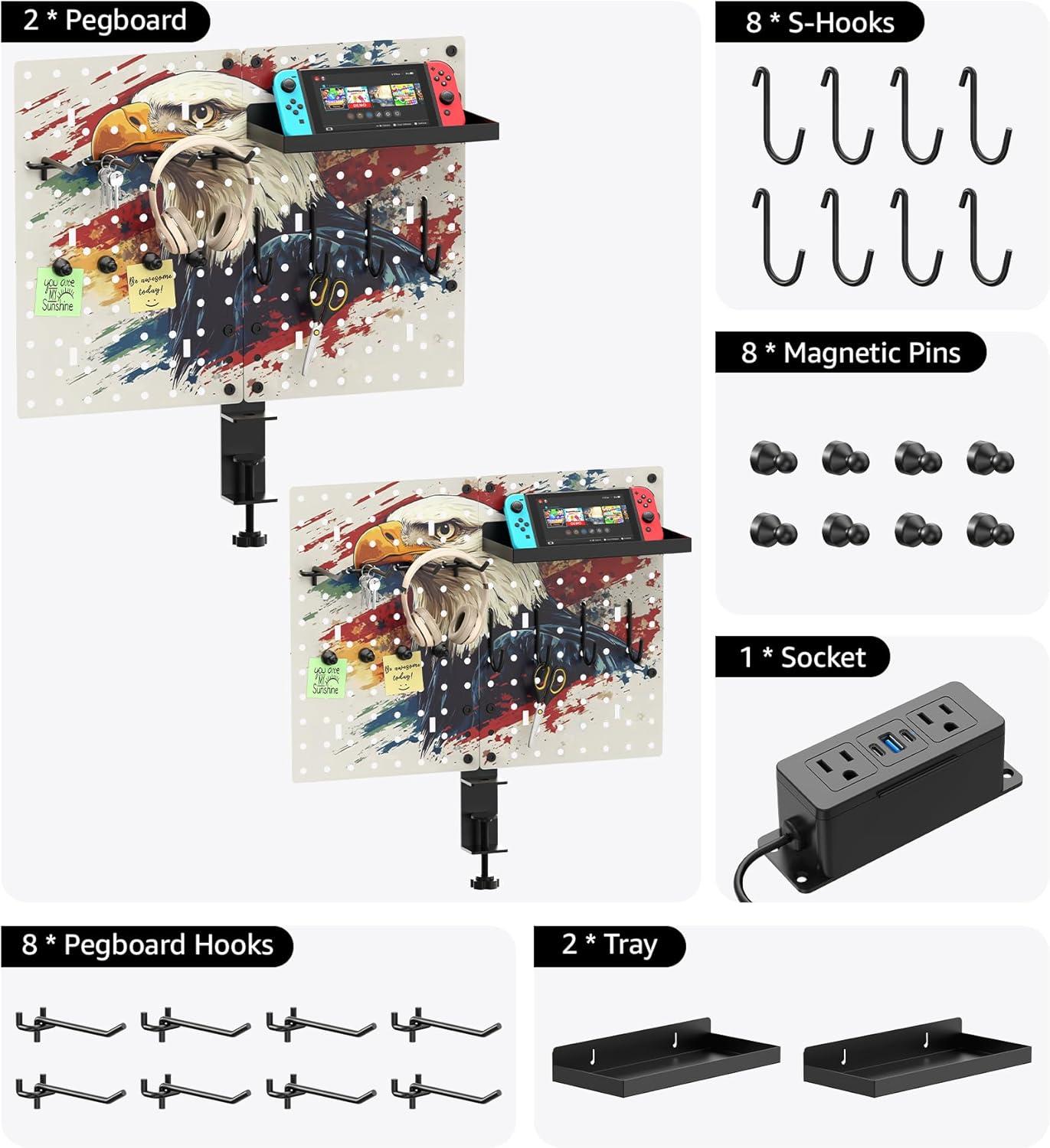Metal desk pegboard organzier and accessories with power strip, come with table pegboards, pegboard hooks and s hooks, magnetic pins and tray. And set up 2 outlets and 3 of USB ports. 6FT flat plug extension cord available.