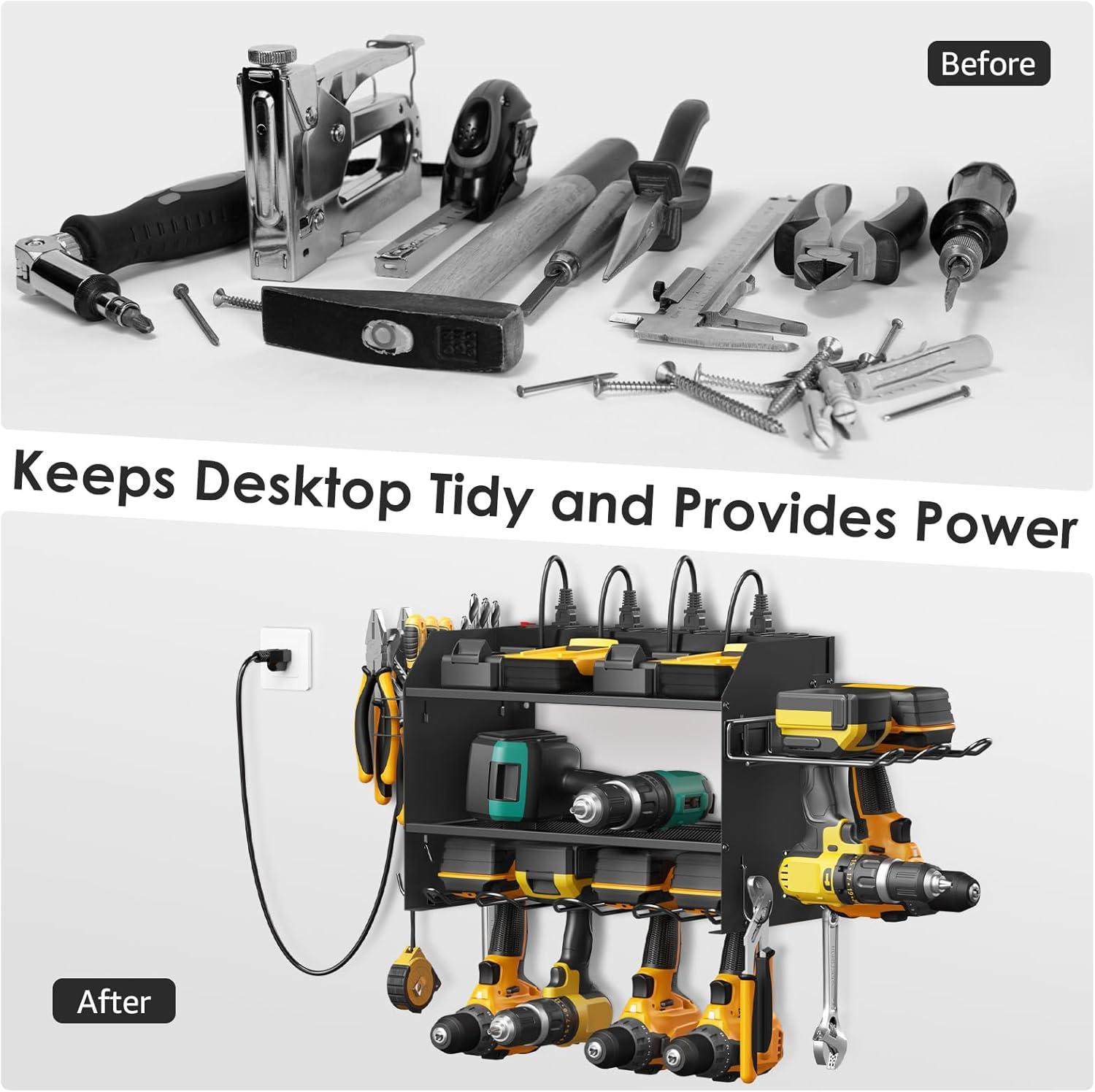 CCCEI Modular Power Tool Organizer Wall Mount Charging Station, Black 6 Drills Holder with 8 Plug Power Strip, Garage Drill Battery Heavy Duty Metal Shelf, Utility Rack with Hooks, Side Storage.(Black)