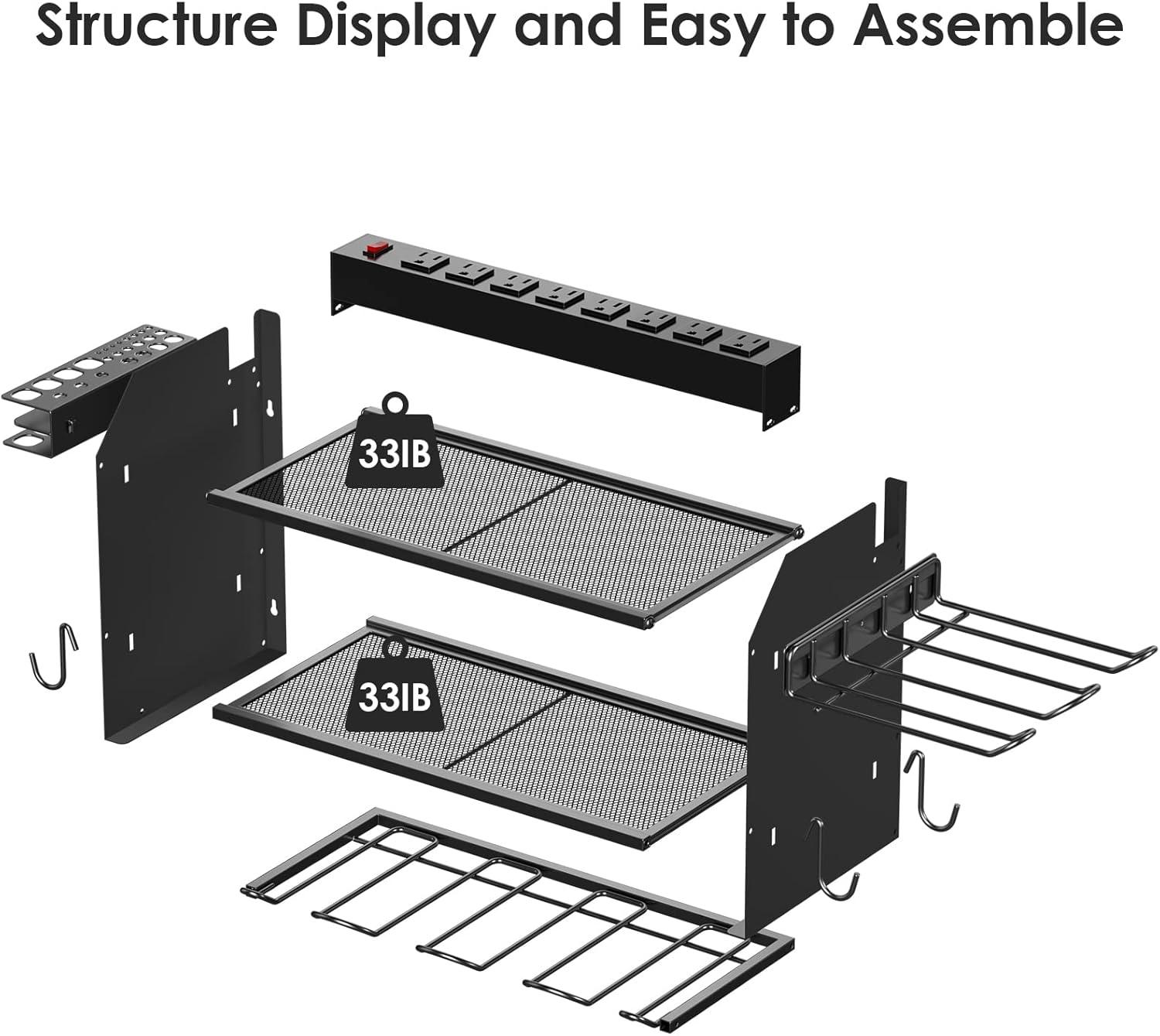 Easy to assemble and mount on a peg board, If you need more storage space, you can connect the two shelves (or more) by screws. Each layer of the grid can support a maximum weight of 33IB. Made from heavy gauge steel.