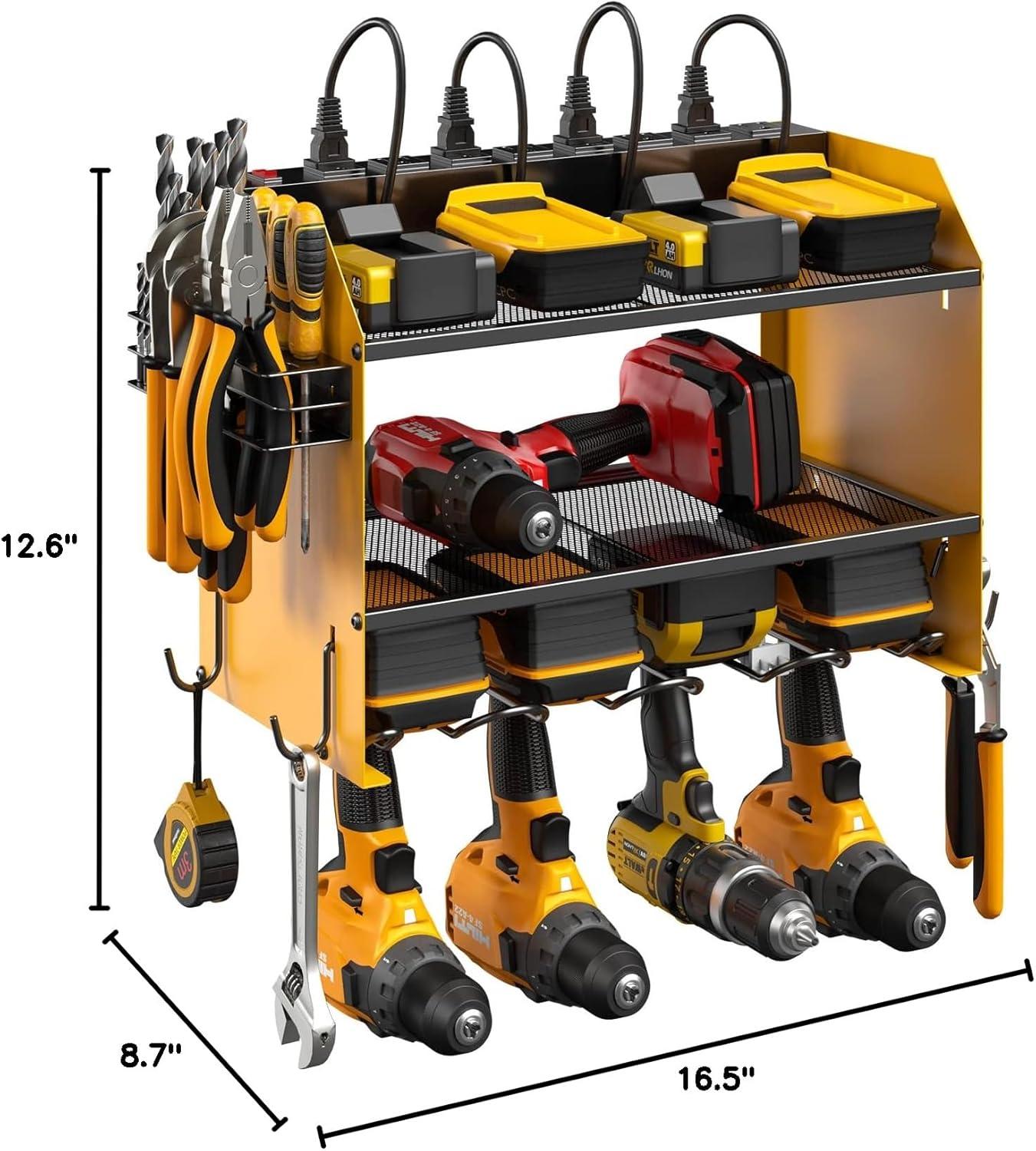 CCCEI Modular Power Tool Organizer Wall Mount with Charging Station. Garage 4 Drill Storage Shelf with Hooks, Screwdriver, Drill Bit Heavy Duty Rack, Tool Battery Holder Built in 8 Outlet Power Strip.(B_Yellow)