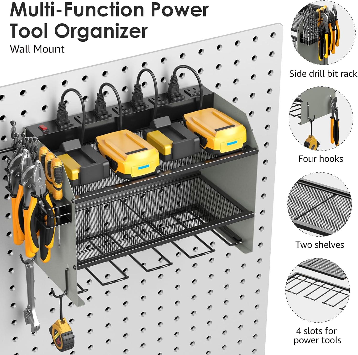 Wall mount power tools organizer come with 4 slots, 4 hooks and drill bit rack, built-in power strip, double layer structure can keep rechargeable tools organized in the work area and save your bench space. The tools in the picture are for demonstration purposes only and are not included.