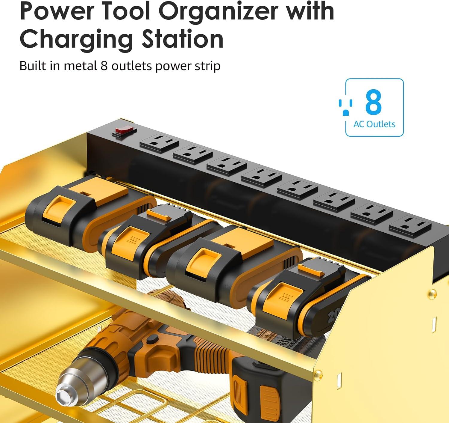 CCCEI Modular Power Tool Organizer Wall Mount with Charging Station. Garage 4 Drill Storage Shelf with Hooks, Screwdriver, Drill Bit Heavy Duty Rack, Tool Battery Holder Built in 8 Outlet Power Strip.(H_Gold)