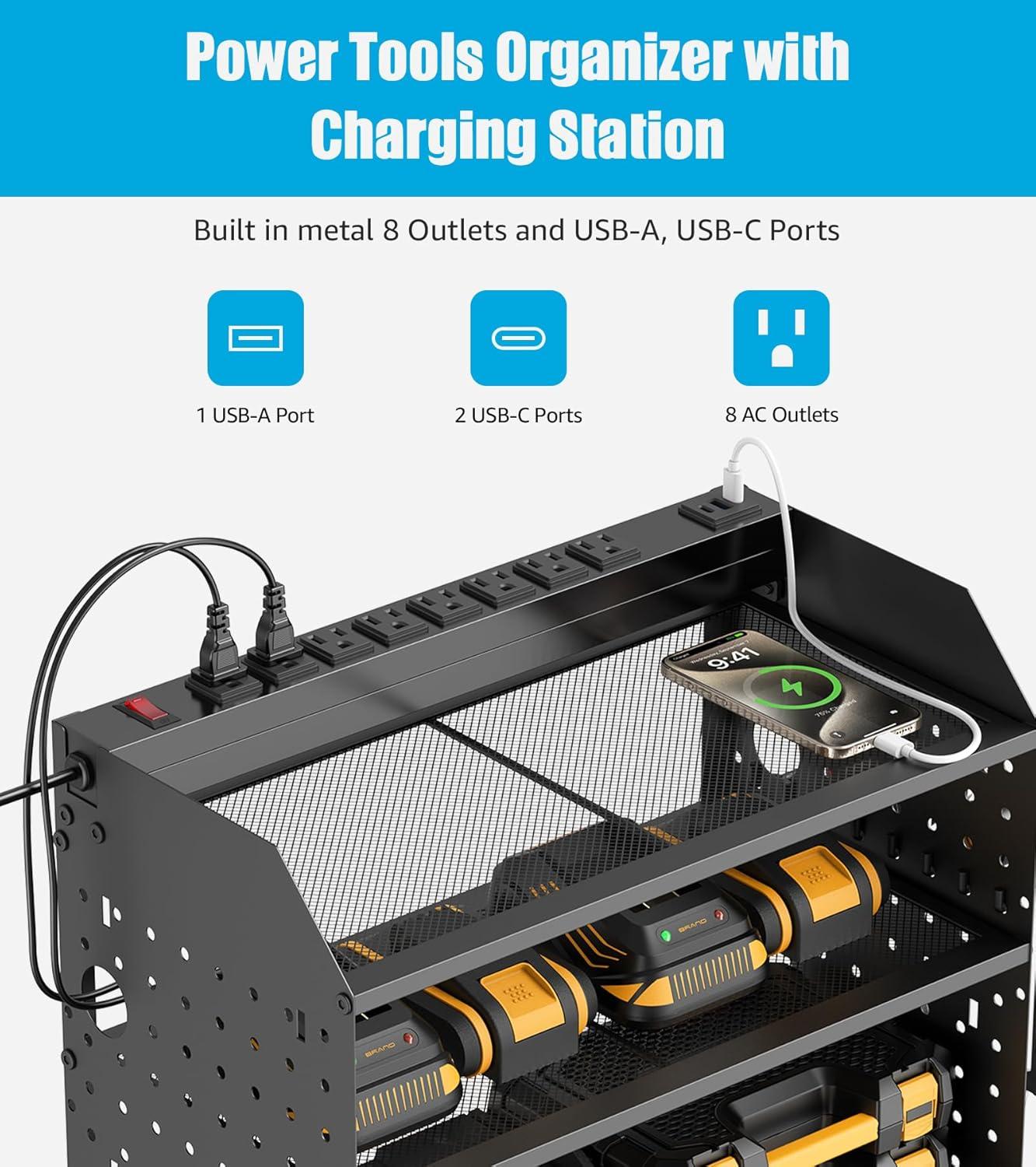 Black power tool organizer with charging station, the charging station features 8 closely spaced outlets, two USB-C ports, and one USB-A port – ready to power anything from plug-in devices to USB gadgets. It truly embodies our original “storage and charging” concept.