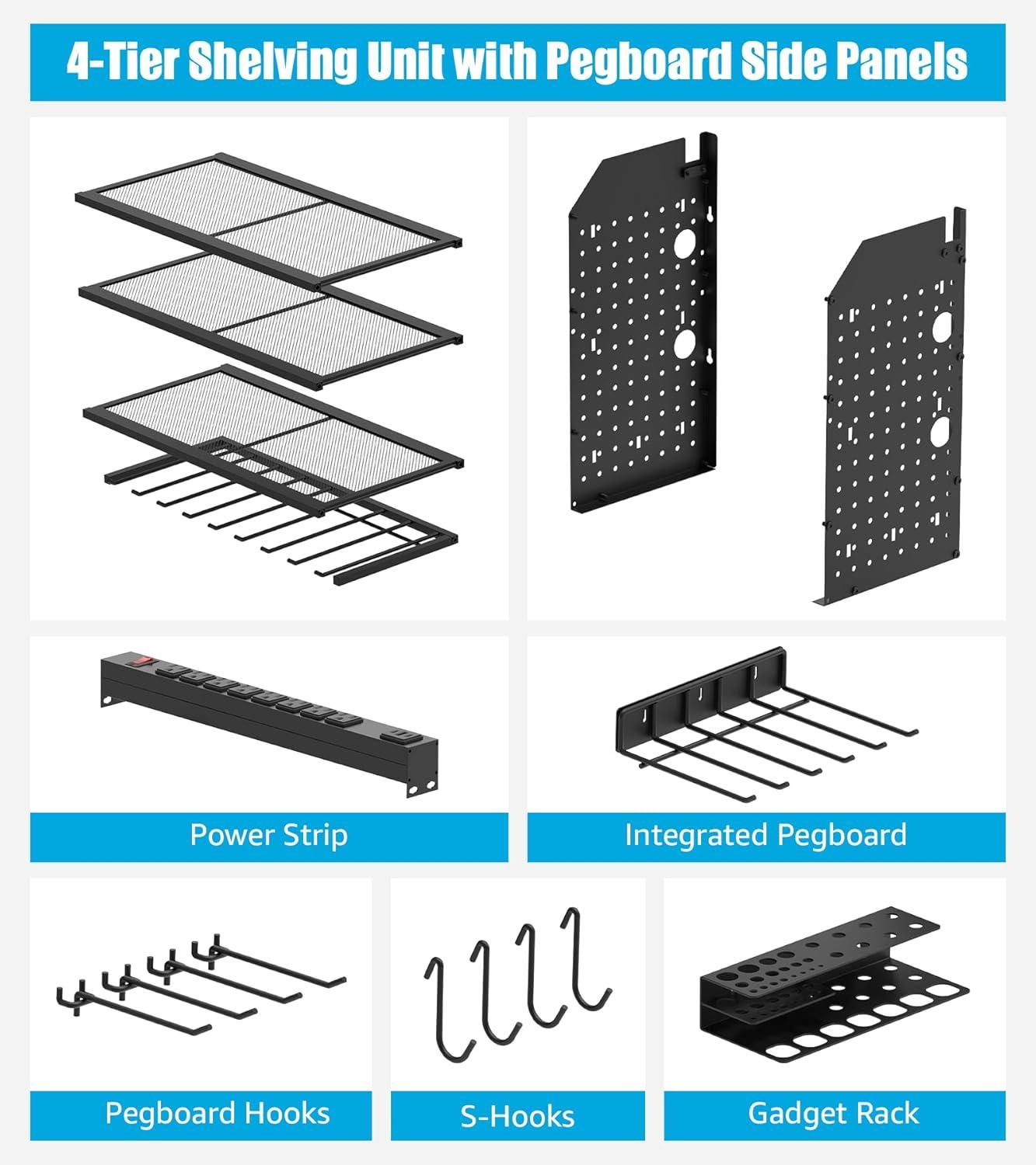 4-tier storage platform design and the sub-top shelf space is adjustable. Includes four S-hooks, four utility pegboard hooks, one 6 pins steel organizer hook and tools organizer rack. Perfectly holds gadgets with holes. AC outlets: 125V/15A/1875W, 6FT extension cord. Utility rack size: L:16.5in * W:8.7in * H:16.57in.