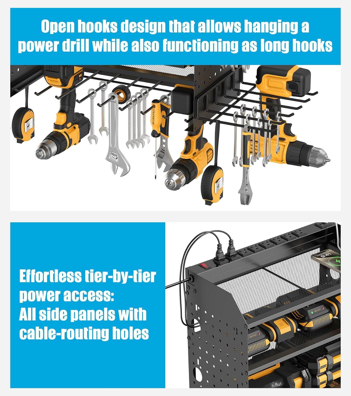 CCCEI Set Power Tool Organizer Wall Mount with Charging Station. Garage 4 Drill Storage Shelf with Hooks, Heavy Duty Metal Tool Battery Charger Organizer. Shop Utility Rack with Power Strip Black.