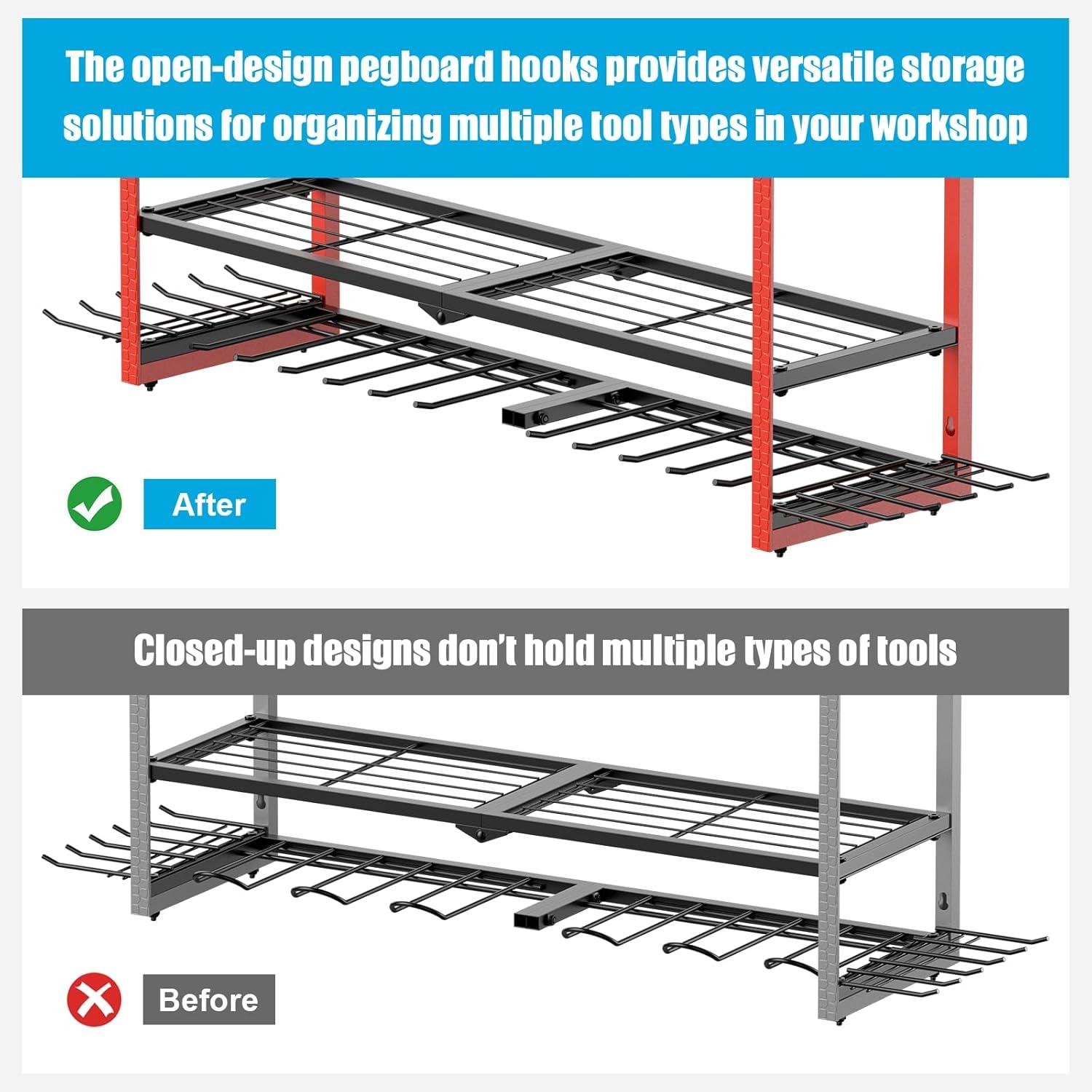This organzier features an open pegboard hooks design (up to 24 hooks), offering versatile storage for power drills, hole-compatible tools, and more.
