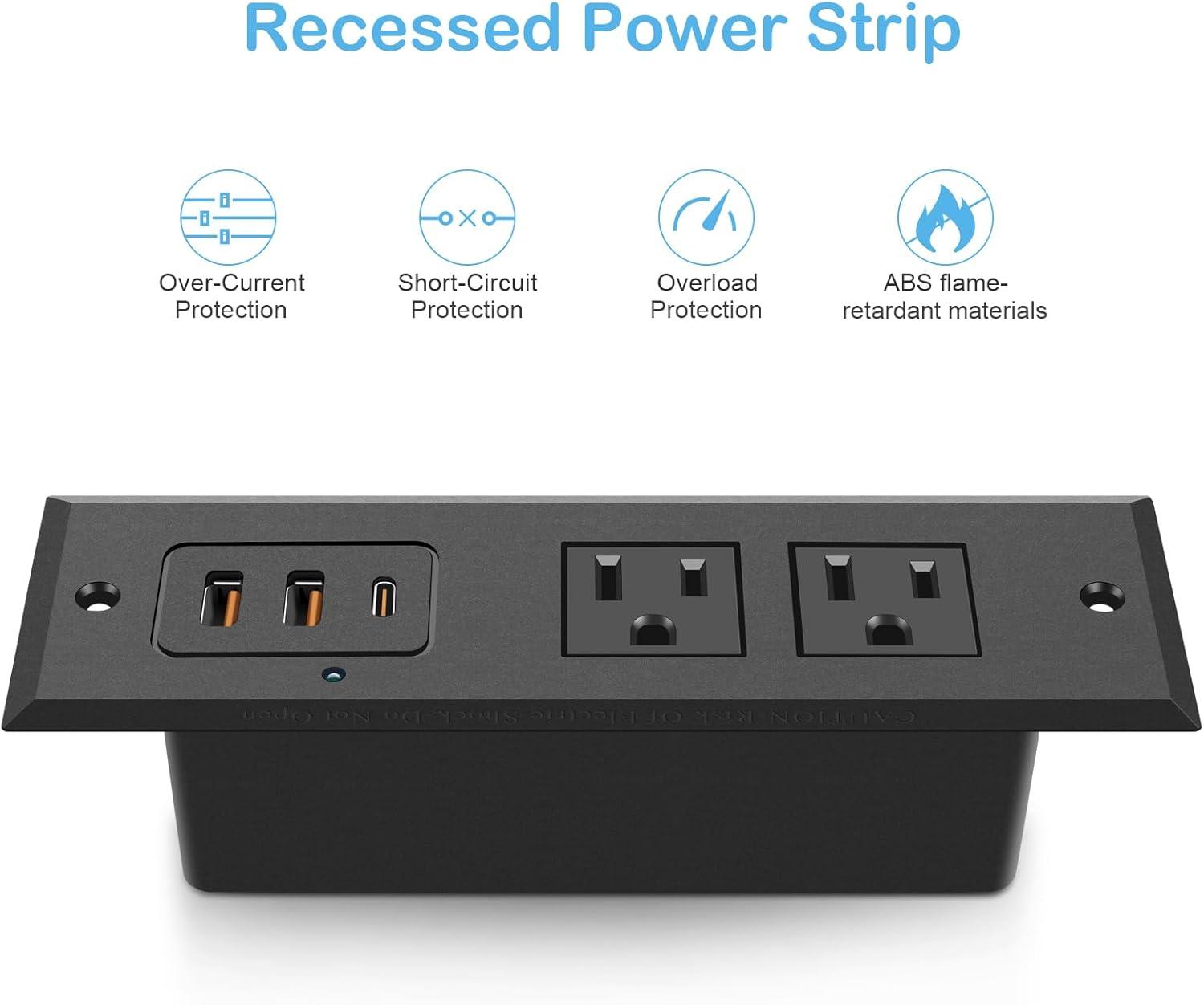 Recessed power strip with fast charging QC 3.0 18W Max USB-A port and PD 3.0 20W Max USB-C port. Come with another ordinary smart USB port, 2 standard US sockets. Great addition to nightstand or furniture table.