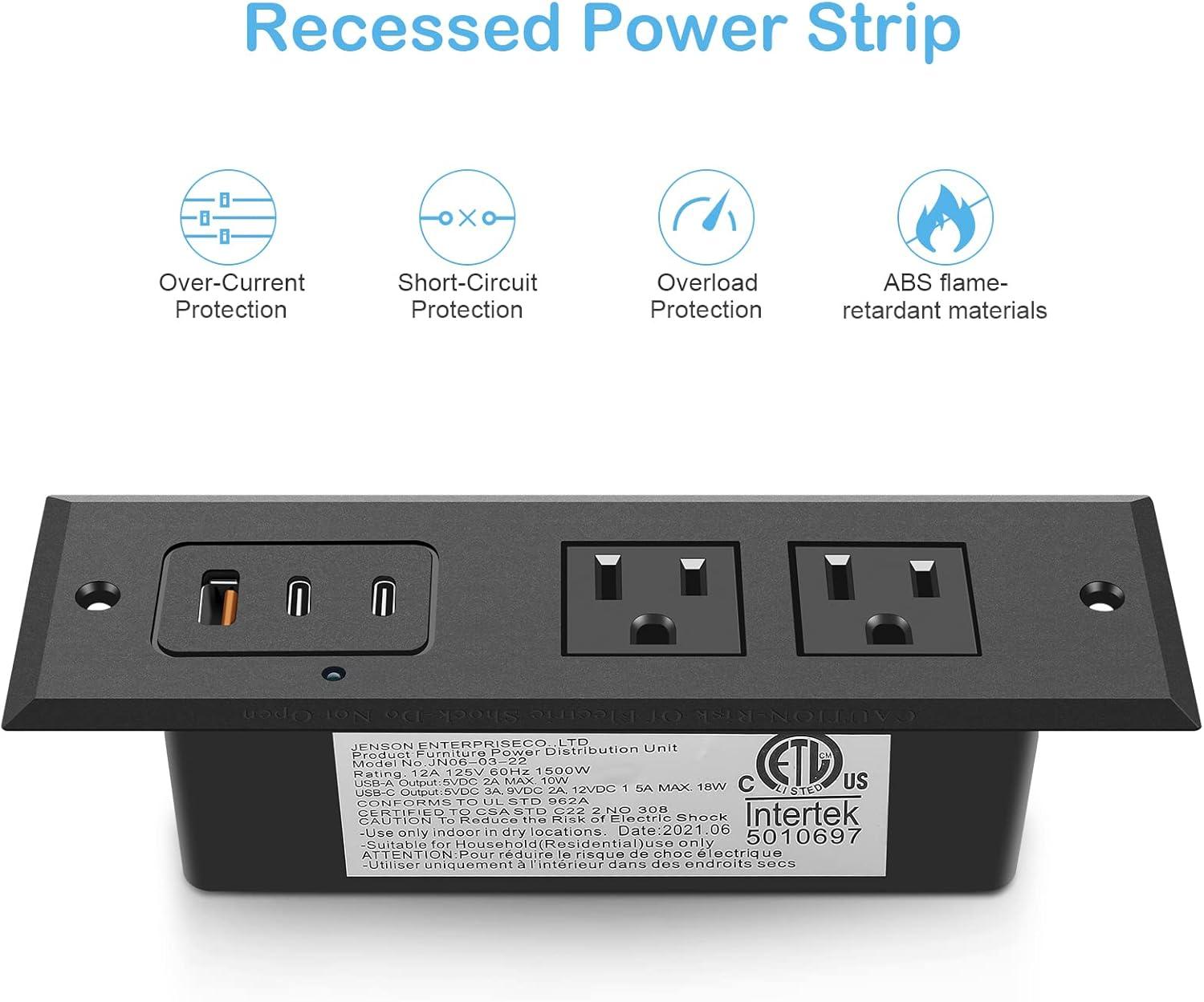 Recessed power strip with fast charging QC 3.0 18W Max USB-A port and 2 PD 3.0 20W Max USB-C ports. Come with 2 standard US sockets. Great addition to nightstand or furniture table.