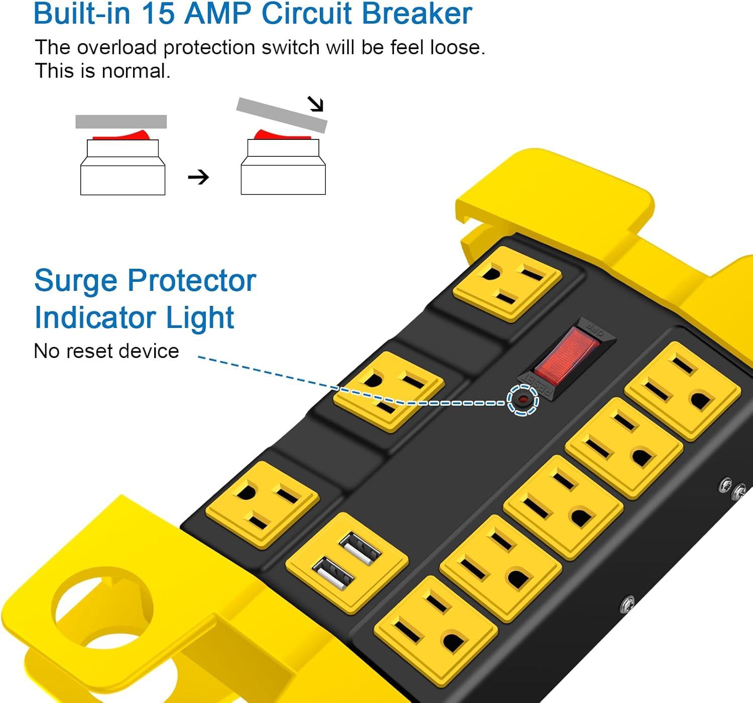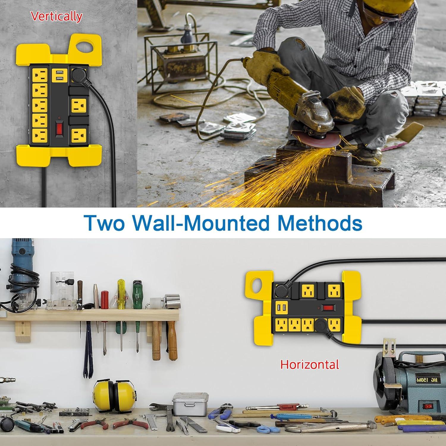 imageHeavy Duty Power Strip with USB Workshop 8 Outlet Surge Protector 2700 Joules Industrial Metal 15Amp Power Strip 6FT Extension Cord and Wide Spaced YellowBlack