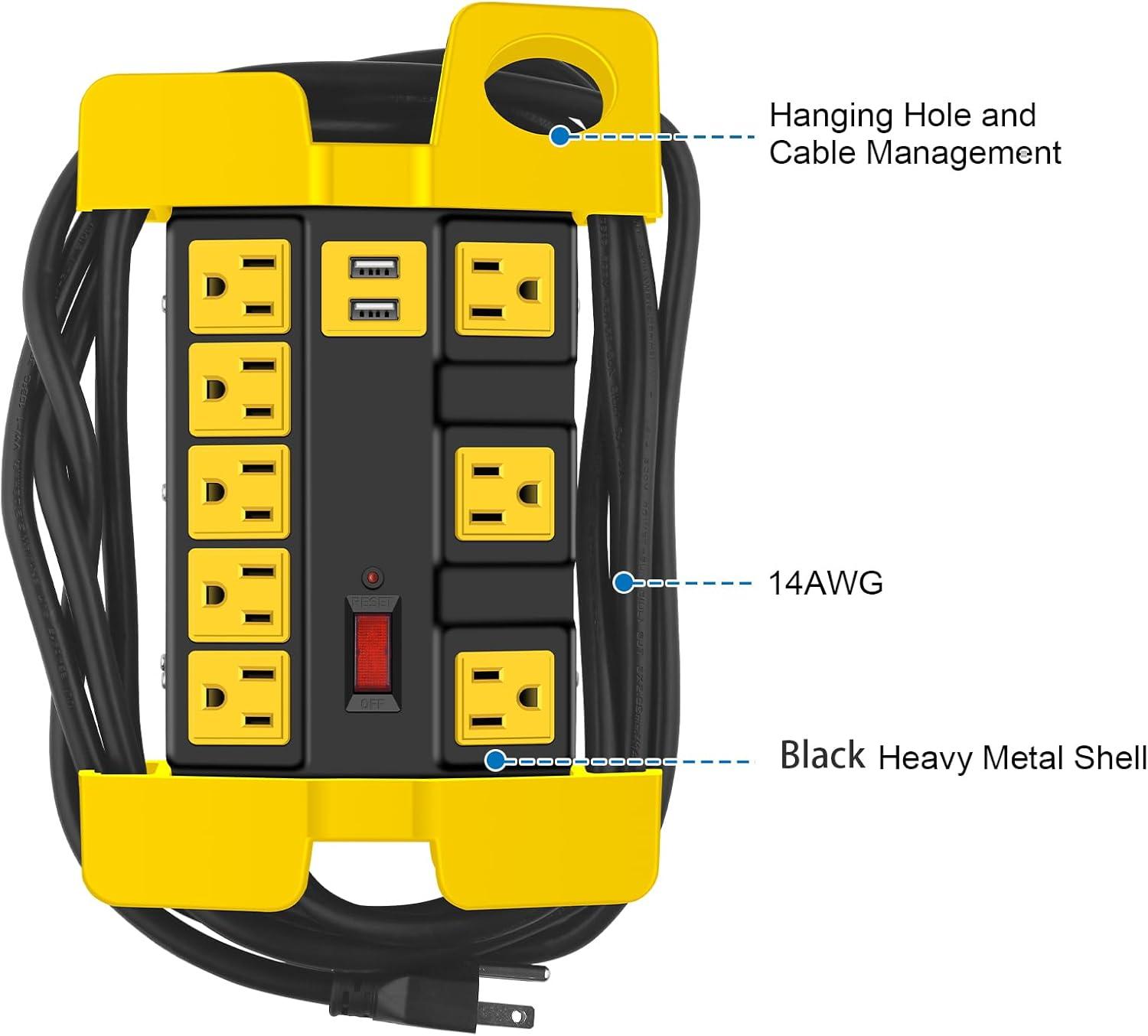 imageHeavy Duty Power Strip with USB Workshop 8 Outlet Surge Protector 2700 Joules Industrial Metal 15Amp Power Strip 6FT Extension Cord and Wide Spaced YellowGreen