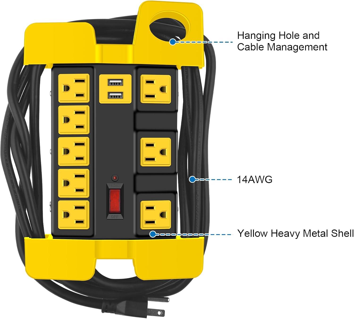 Heavy Duty Power Strip with USB, Workshop 8 Outlet Surge Protector 2700 Joules, Industrial Metal 15Amp Power Strip, 6FT Extension Cord and Wide Spaced. Yellow(Black)